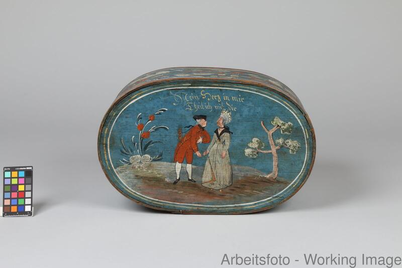Auf dem Deckel ist ein höfisches Paar aus der Zeit um 1780 dargestellt. Der Herr, der sich vor der Dame verbeugt, trägt einen roten Rock, eine Kniebundhose und einen Dreispitz. Die Dame kleidet eine Haube, ein Schultertuch (Fichu) und ein langes Kleid. Farblich abgestimmte Blumen und ein Baum bilden einen landschaftlichen Hintergrund. Über dem Paar steht geschrieben: „Mein Herz in mir / Theil ich mit dir“. Derartige (Liebes-)Paare und ähnliche Sprüche bildeten ein besonders beliebtes Sujet auf den meist ovalen Spanschachteln.