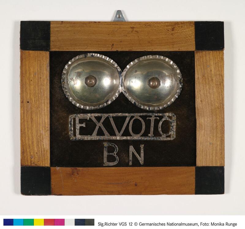 Seit dem Barockzeitalter schätzte das Bürgertum Silber als Material für Votivgaben. Mit der Epoche der Aufklärung gewann Silber zunehmend an Bedeutung, weil damals die naiv gemalten Votivtafeln in die Kritik gerieten und echte, edle Materialien bevorzugt wurden. Im Fall dieses Brustvotivs wurden verschiedene Einzelelemente des wertigen Materials zu einer Tafel zusammengefügt. Die beiden kreisrunden Brüste stellen jedoch kein reales Abbild weiblicher Brüste dar.