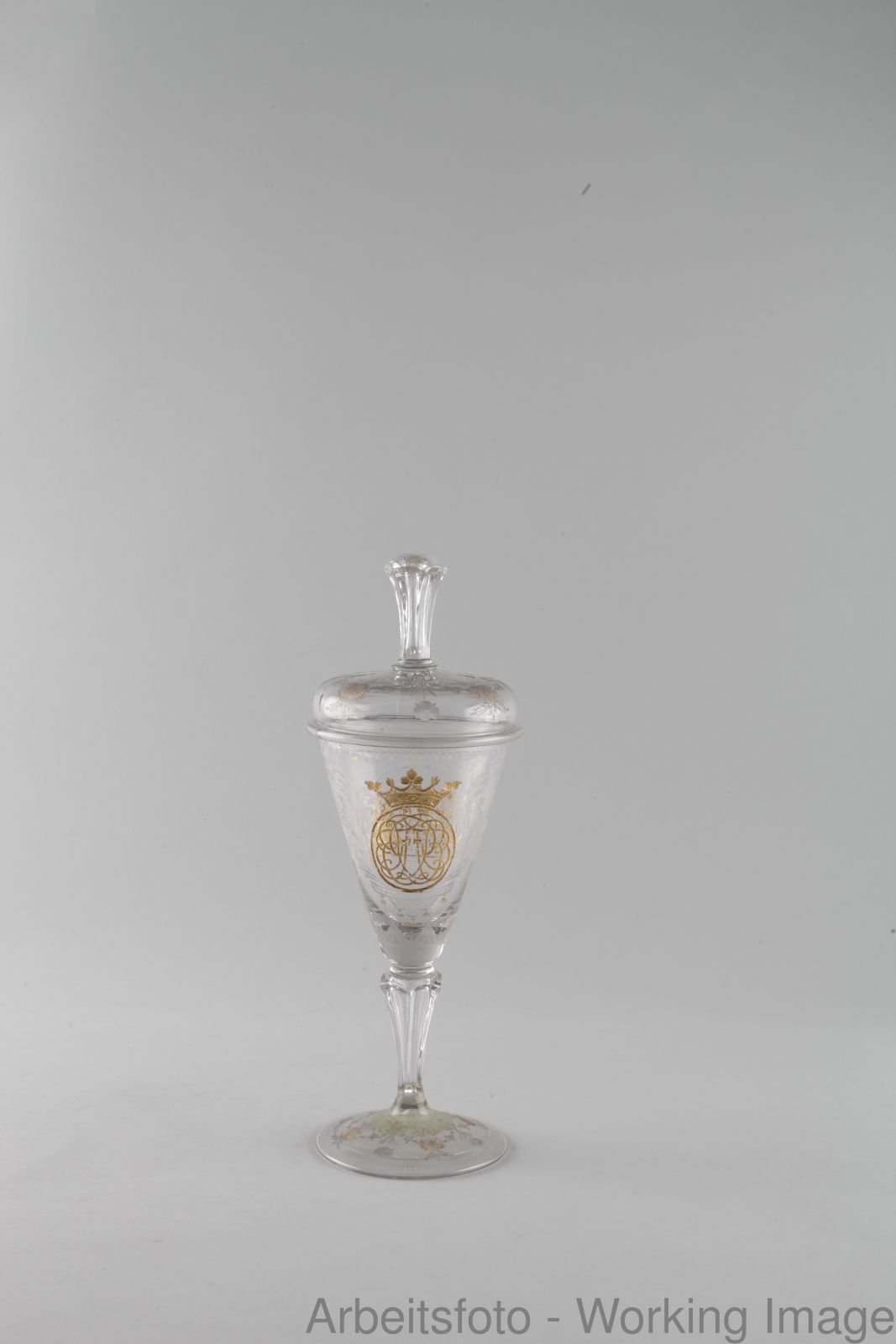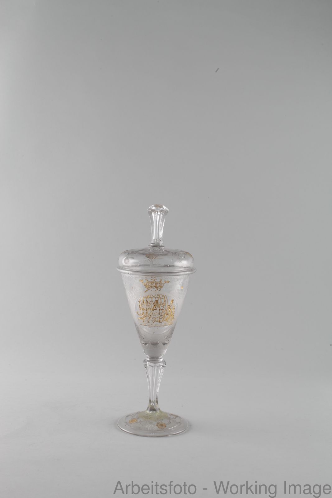 Glaspokal mit Monogramm und Tugenddarstellungen