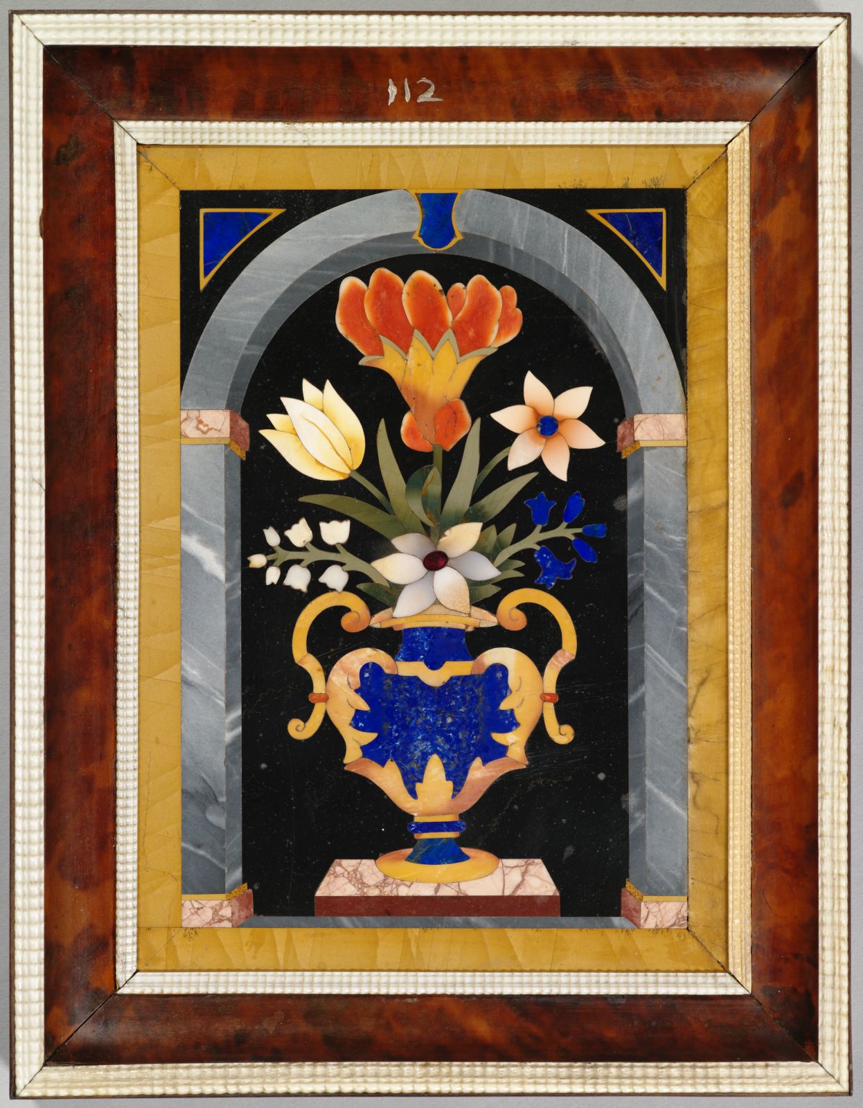 Füllung: unterschiedliche Steinsorten (Marmor, Lapis Lazuli, etc.); Rahmen: Eichenholz, Bein, Schildpatt - Füllung: Inkrustation, Pietra Dura; Rahmen: furniert