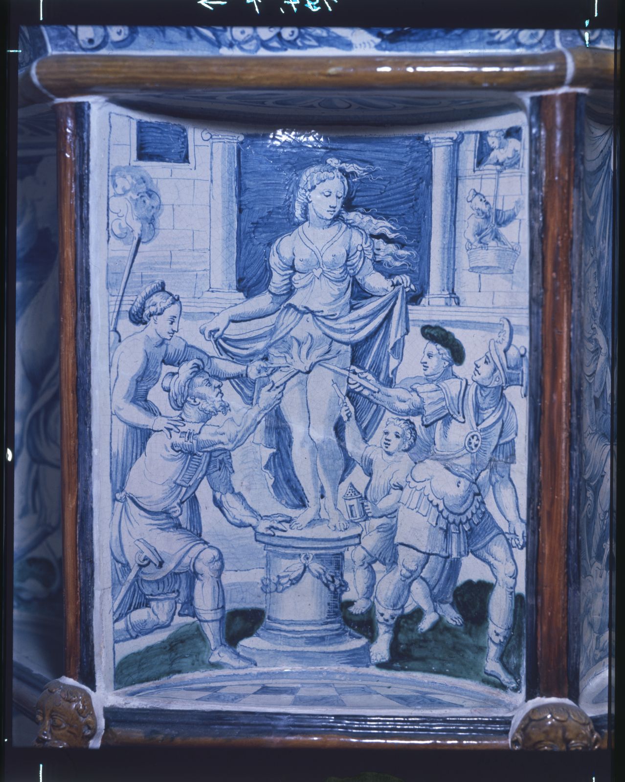 Fayence, bemalt vorwiegend in Blau unter sparsamer Verwendung von Grün, Ockergelb, Mangan und geringen Resten von Vergoldung