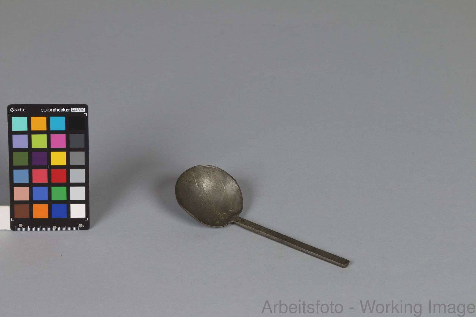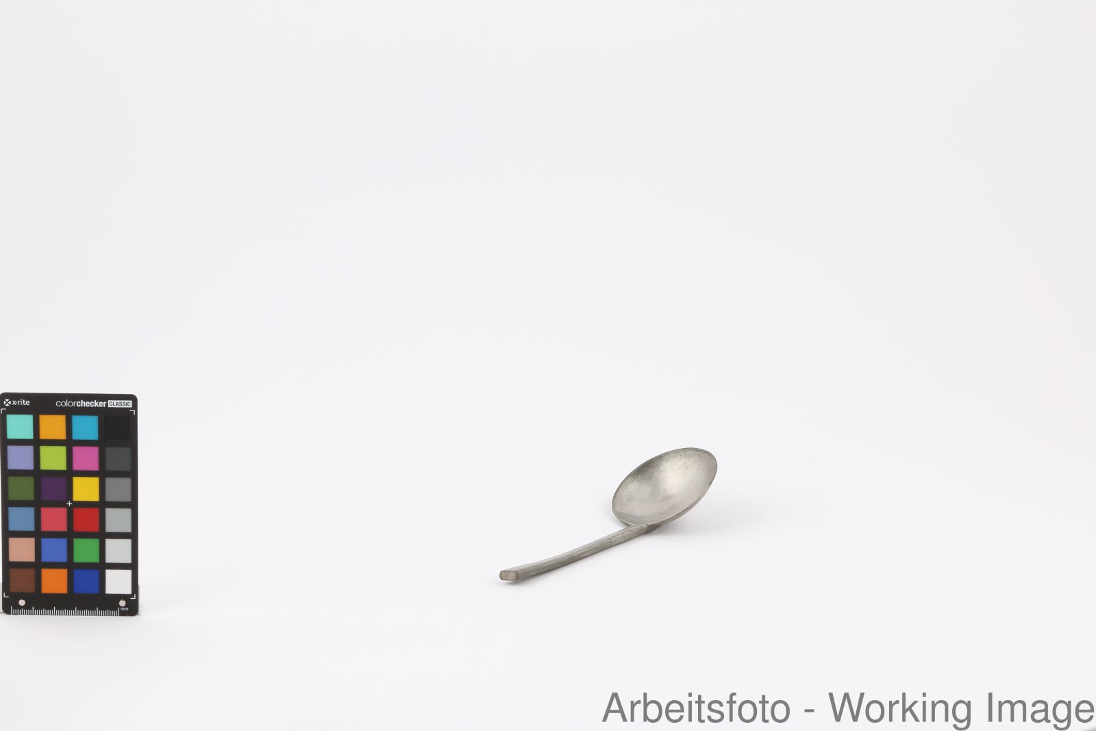 Zinnlöffel mit runder Laffe und flachem, kantigen Stiel
