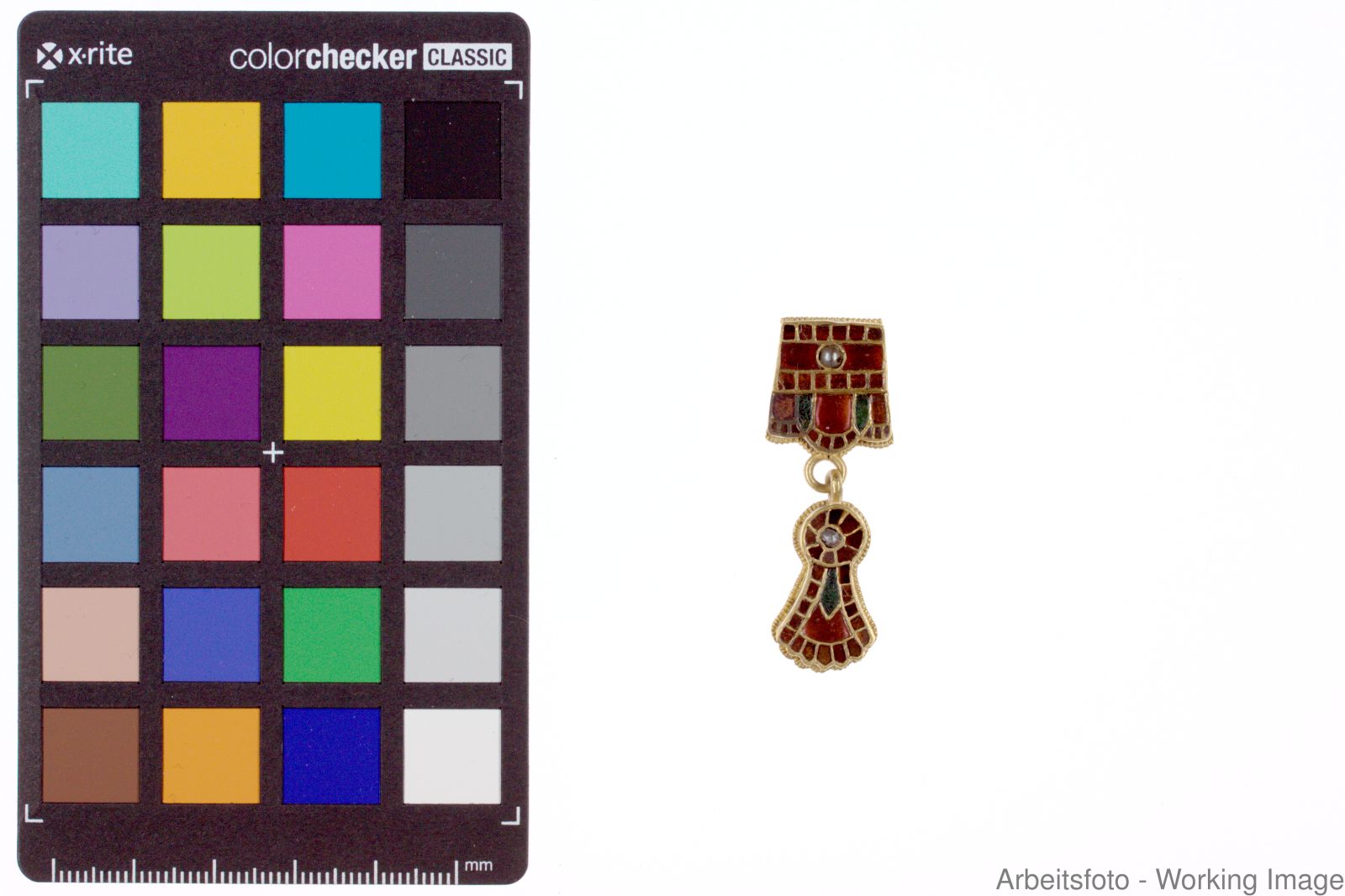 Gold, Almandin, Glas, Kitt, Perldraht, Perle, Glasfluss - silbervergoldet, gelötet, geschliffen