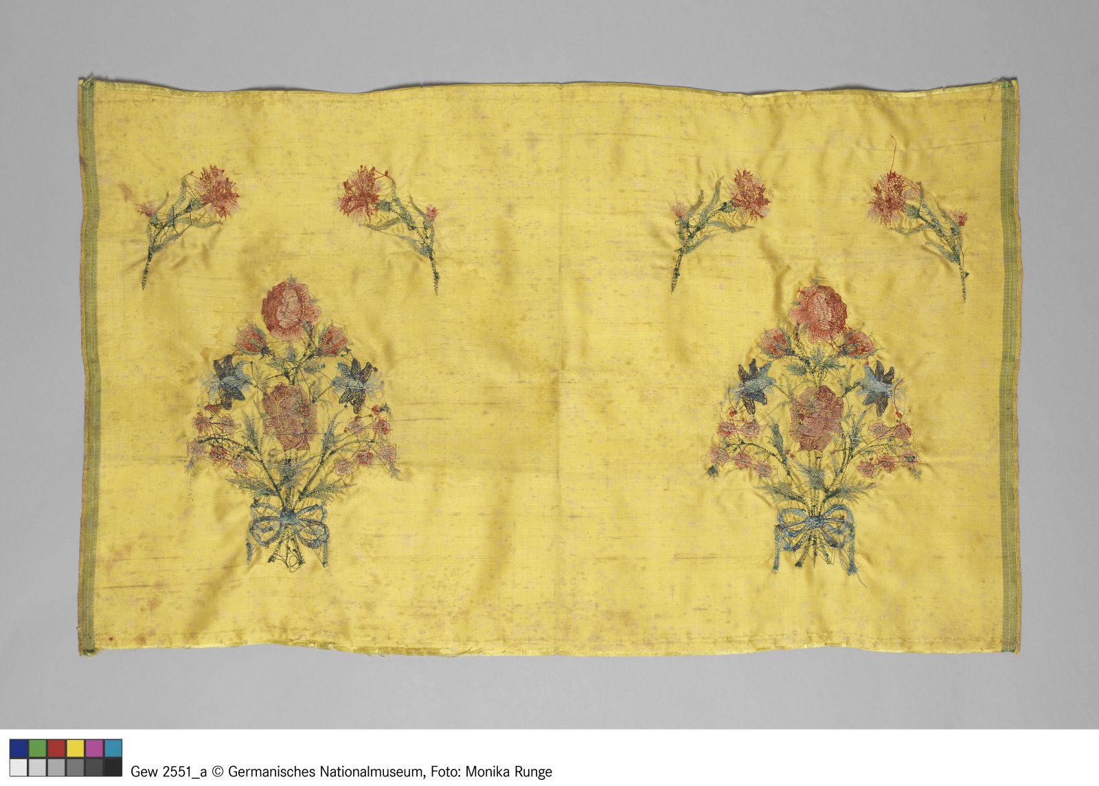 Seidenatlas, gelb, Verzierung: Seidenstickerei, mehrfarbig, Platt-, Stiel- u. Knötchenstich; Schnittzeichnung von Hand, schwarz