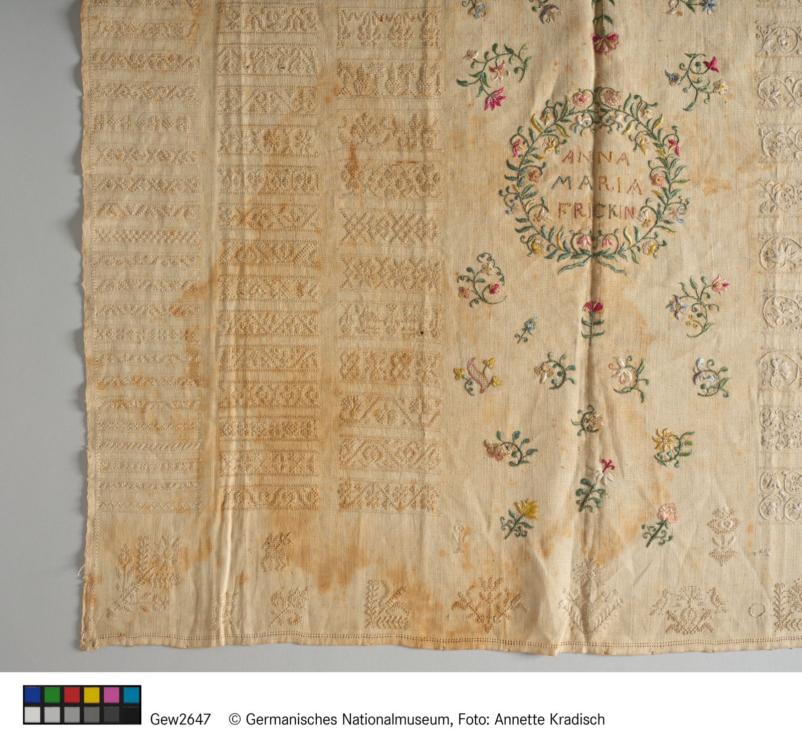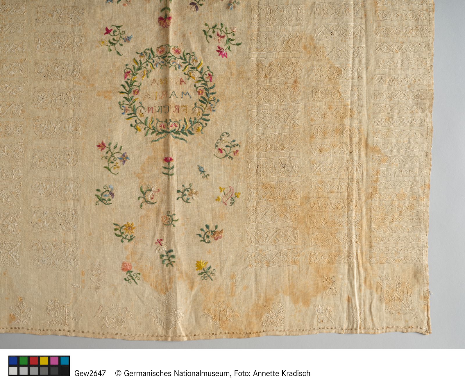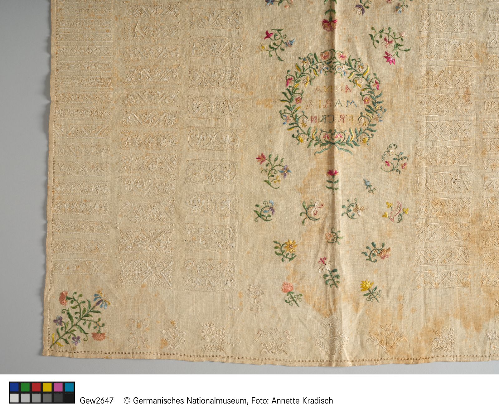 Grund: Leinen, gebleicht, Leinwandbindung, Kette: 24-26 Fäden/cm, Schuß: 22-23 Fäden/cm, linke Seite Webkante