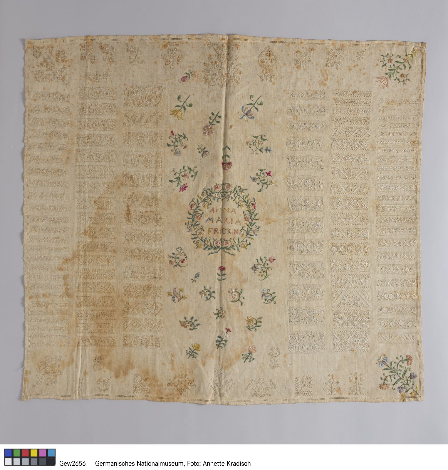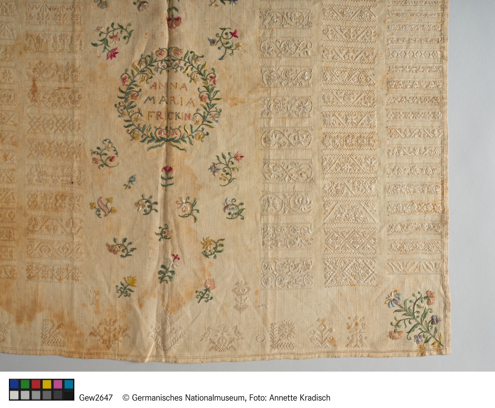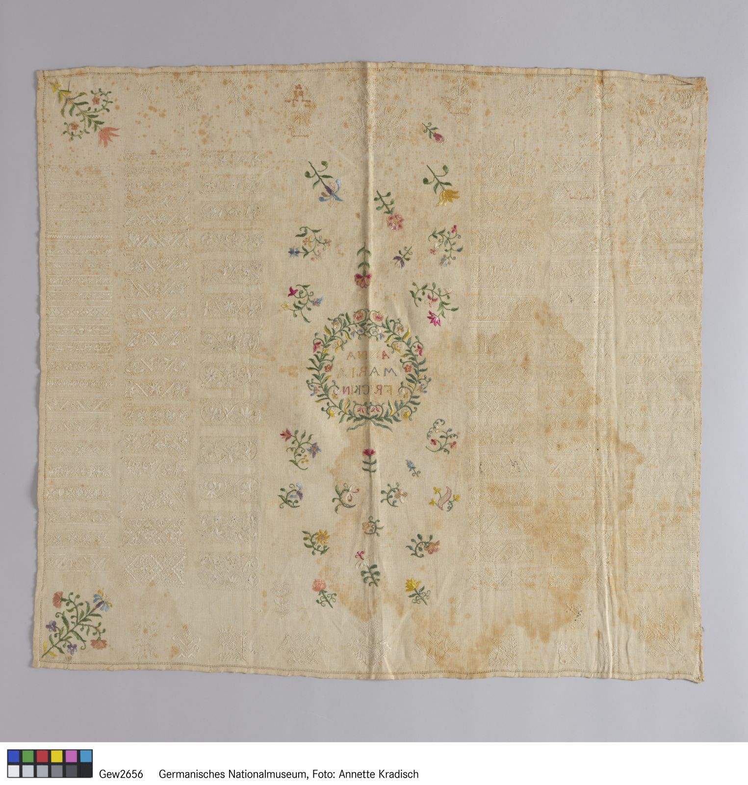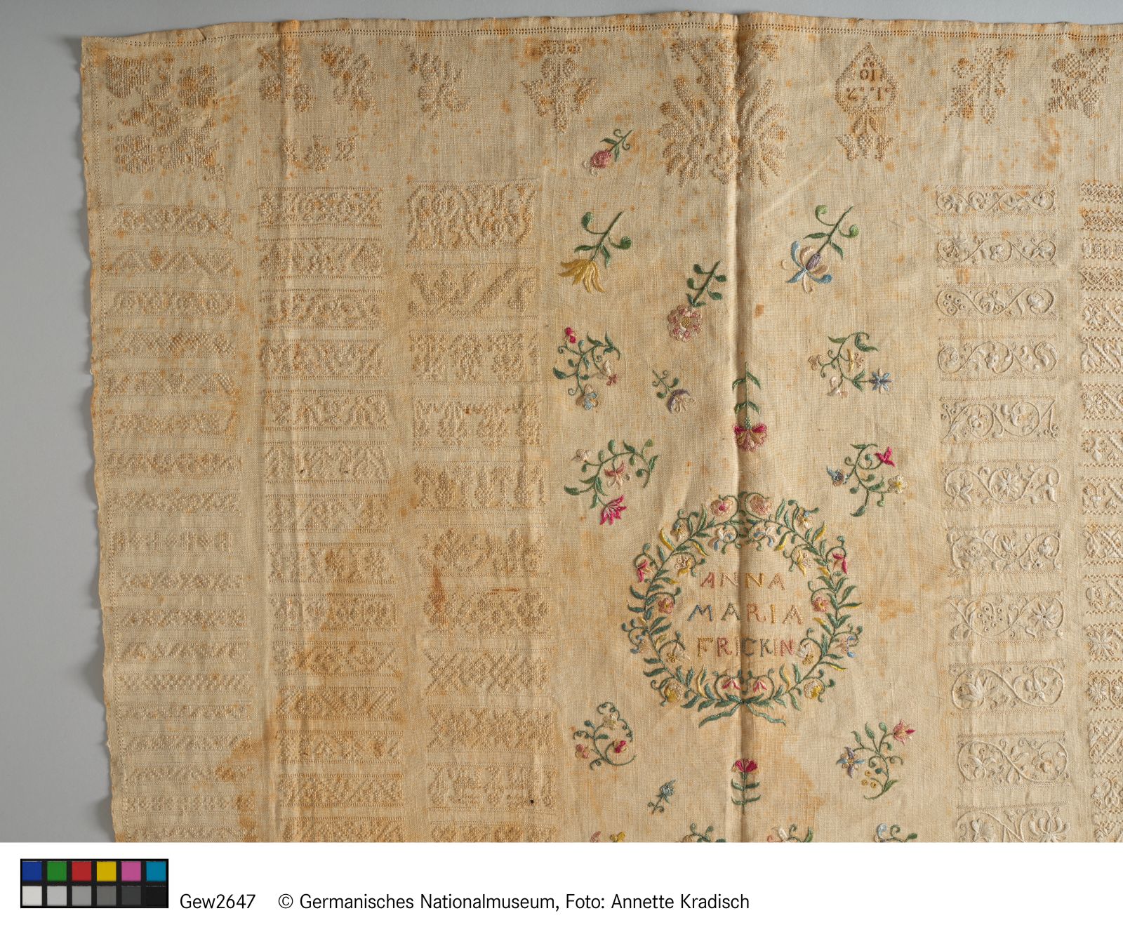 Grund: Leinen, gebleicht, Leinwandbindung, Kette: 24-26 Fäden/cm, Schuß: 22-23 Fäden/cm, linke Seite Webkante