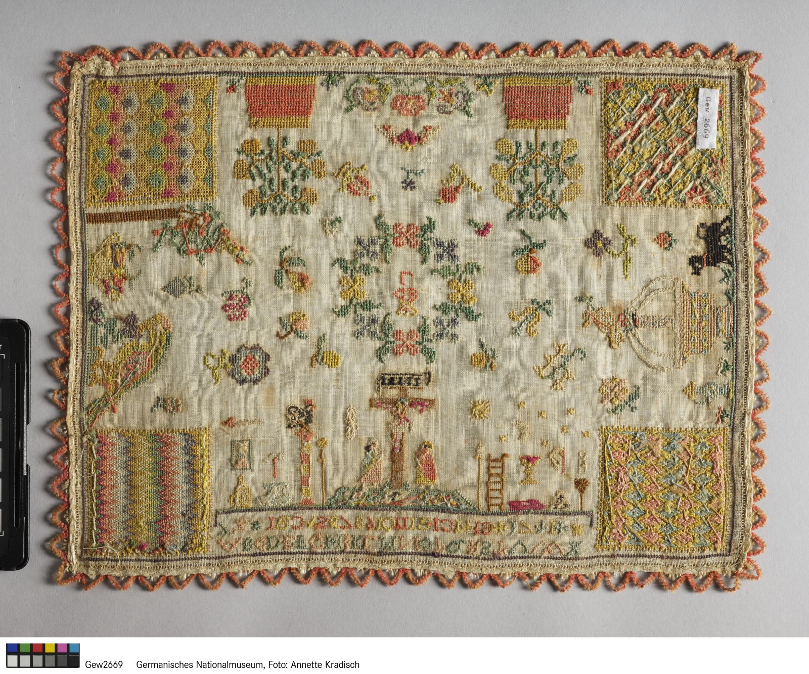 Technik: einfacher und doppelseitiger Kreuzstich, versetzter gerader Gobelinstich, Stielstich, Holbeinstich, versetzter Plattstich, Renaissancestich, Steppstich, aufgestickte Perlen; Leiterhohlsaum