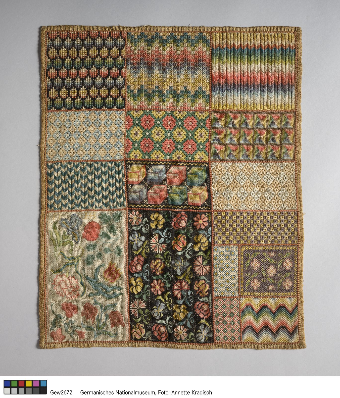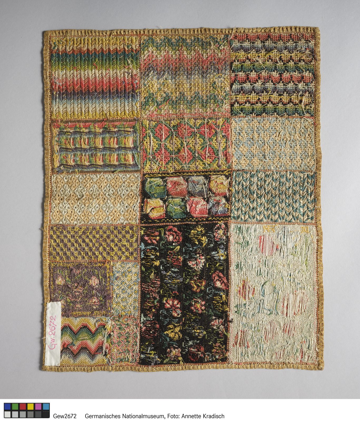 Technik: Zopfstich, senkrechter und doppelseitiger Kreuzstich, petit point, schräger Plattstich, geschlossener Strahlenstich, Renaissancestich, Reisstich; Langettenstich