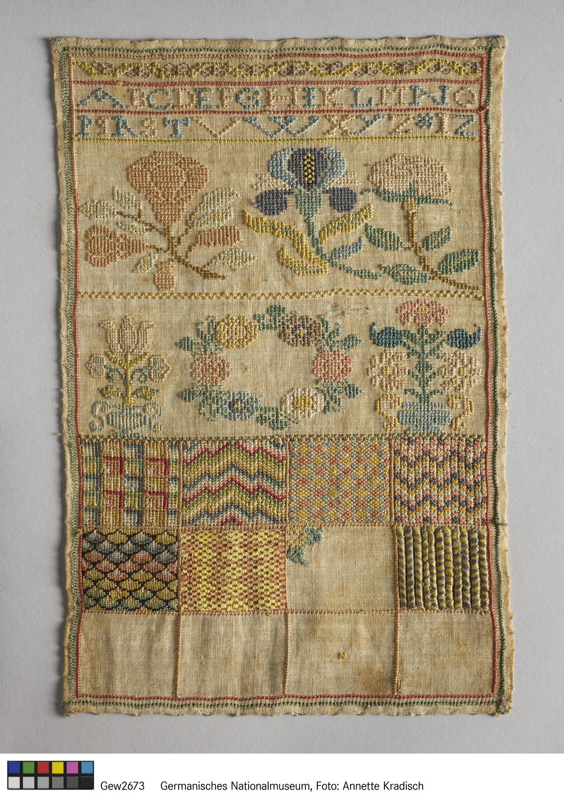 Technik: doppelseitiger, z.T. seitlich gerahmter Kreuzstich, Holbeinstich, senkrechter Kreuzstich, Reisstich, petit point, Würfelstich, Renaissancestich, Schrägstich; einfacher Hohlsaum