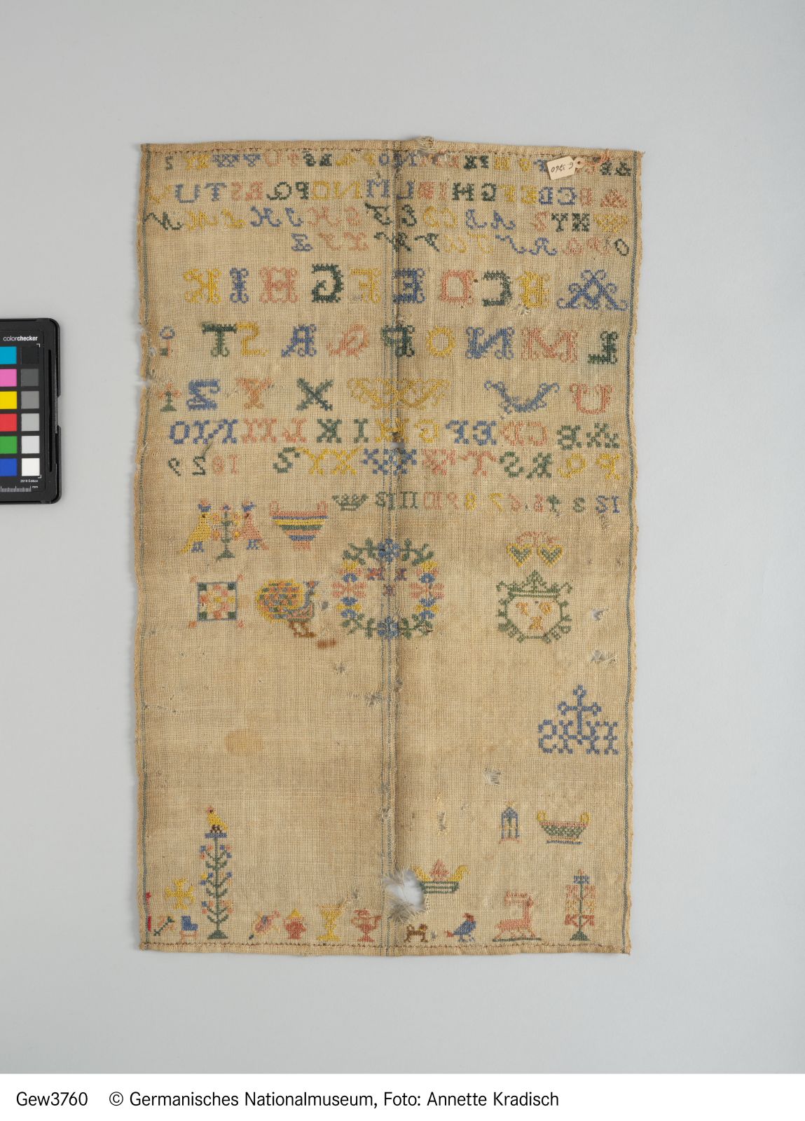 Muster: Stickerei, Seide, gelb, rosa (2 Töne), rot, grün (2 Töne), blau (2 Töne), beige, braun, schwarz, Baumwolle rot