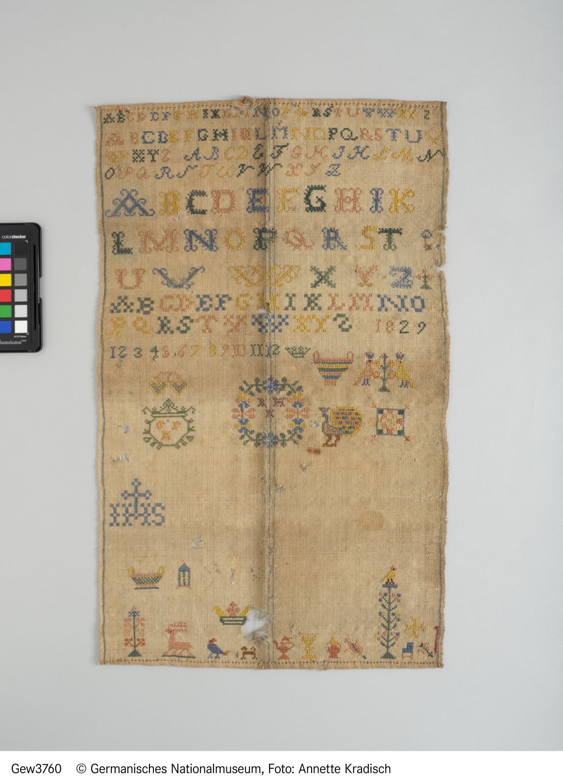 Technik: doppelseitiger Kreuzstich, Kästchenstich; Büschelhohlsaum
