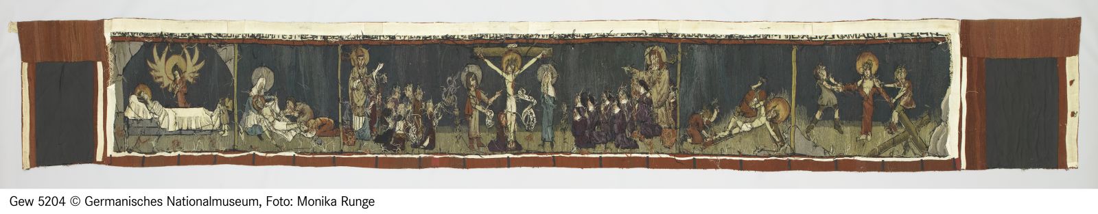 Wandteppich mit Kreuzigung, vier Passionsszenen und zwei Engeln
