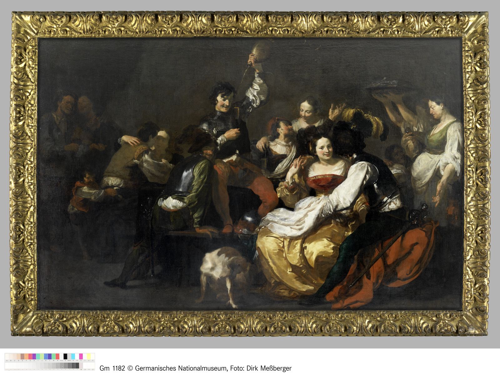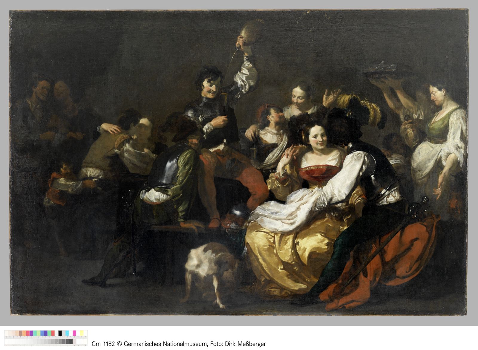 ; Das Gemälde setzt die Kunst Caravaggios (1571-1610) voraus, weshalb es Liss' vermutlich während seines römischen Aufenthalts in der Zeit um 1623-1626 gemalt hat. Entweder ist das Bild in Rom oder nach seiner Rückkehr nach Venedig - dafür spräche Sandrarts Formulierung "Venetianische Courtisanen" (Sandrart/Peltzer, 1929, S. 187f) - entstanden. -- Rüdiger Klessmann (1992, S. 30) machte außerdem auf ein 1614 in Amsterdam publizierte Emblem aufmerksam, welches unter dem Motto "Pessima placent pluribus" einen Mann zeigt, der während des Trinkens sein Glas aus der Weinkanne nachfüllt. -- Eduard A. Safarik (1975) macht allgemein auf motivische Zusammenhänge zwischen dem Gelage und Bildern von Domenico Fetti (um 1589-1624) aufmerksam. - Nach Klessmann (1999) ist das Gemälde 1622/23 in Rom entstanden.; Thematisch in Zusammenhang steht eine eigenhändige Zeichnung von Liss im Museum Bredius in Den Haag (Inv.Nr. T 83-1946), die ebenfalls ein Soldatengelage zeigt.; Kopien: Eine heute noch bekannte Kopie (Werkstatt?) des 17. Jahrhunderts befindet sich in den Staatlichen Kunstsammlungen Schloss Wilhelmshöhe in Kassel (Inv.Nr. 187; vgl. Tacke 1995, Abb. 118); Öl auf Leinwand, 164,5 x 242 cm. Das Gemälde weist keine Pentimenti auf, so dass es sich bei ihm nach Michael Graf von der Goltz (1992) "um eine flotte, nahezu zeitgenössische, venezianische Kopie handelt" (M. Graf von der Goltz, 1992, mschr. S. 78). --- Wieviele unbekannte, verschollene Kopien es gibt/gab, ist unbekannt. Von solchen abgesehen, kann trotzdem bis zur Inventarisierung des Kasseler Bildes (1749) bei den frühen Erwähnungen entsprechender Gemälde nicht immer mit Sicherheit gesagt werden, auf welches Bild, das Kasseler oder das des GNM, sich die Angaben beziehen. --- Nach dem Stich von Falck gibt es zahlreiche Kopien, die man - folgt man der von Tacke vorgetragenen Auffassung, dass der Falck-Stich auf das Gemälde des GNM zurückgeht - als "Enkelbilder" ansehen kann: Museum der bildenden Künste zu Leipzig (Inv.-Nr. 790) von Egbert von Heemskerck (1610-1680), Öl auf Leinwand, 45,8 x 58,3 cm; 1970 in der Galerie Hoogsteder, den Haag (Öl auf Holz, 43,5 x 36 cm; Abb. in: Weltkunst 40, 1. August 1970, S. 929); in einer Hagener Privatsammlung (Öl auf Leinwand, ca. 28 x 40,5 cm; Unterlagen mit Abb. im GNM). Auf der Auktion bei Grauoe und Ball (Berlin) vom 23.-24.6.1933 wurde eine 36 x 45 cm große Kopie ("Bez. J. van Lys fec.") versteigert (= Witt Library, London); weitere Kopien nach dem Stich von Falck im Kunsthandel der 1930er und 1940er Jahre nennt Graf von der Goltz (1992, mschr. S. 82-86). Der Kat. 1934 führt noch "alte Kopien in der Villa Petroja bei Florenz, in der Pinakothek zu Bologna (Nr. 708) und in Münchner Privatbesitz" an.; Vor- und Nachzeichnungen: Kurt Steinbach (1940, S. 66 f.) nannte fünf Zeichnungen, die im Zusammenhang mit dem "Gelage von Soldaten und Dirnen" stehen: dabei hielt er die Fassung der Uffizien (vgl. Tacke, Abb. 116) für die authentische: Federzeichnung in brauner Tinte über brauner Tintenlavierung auf rosa laviertem Papier, 23,1 x 33,9 cm; Gabinetto dei disegni degli Uffizi (Schenkung Santarelli, 1866), Florenz. Lisa Oehler (1962) untersuchte die von Steinbart genannten Zeichnungen und will die Leidener Studie (Prentenkabinet der Rijksuniversiteit, Inv.Nr. PK 2186) vor der in den Uffizien genannten wissen und in den anderen drei späteren Wiederholungen nach diesen beiden Zeichnungen (nicht nach den Gemälden, da die Zeichnung das Federbarett zeigt, welches zum Helm wurde; Pentimenti) durch andere Hände.; Graphiken: Wahrscheinlich noch in Italien hat eine der beiden heute noch bekannten Fassungen, der in Kassel und der in Nürnberg, Mathäus Strasser (gest. 1659) gesehen, der Teile der Komposition für seine Zeichnung im Frankfurter Städelschen Kunstinstitut (Inv.Nr. 701) übernahm. (Schilling 1973, S. 90, Nr. 545, Abb. Tafel 101, folgt der üblichen Auffassung, das Kasseler Bild sei das Original und will demnach Teile der Zeichnungen dem Kasseler Bild entlehnt wissen). Die Zeichnung ist vom Künstler mit 1642 datiert und mit einem in italienischer Sprache verfaßten Sinnspruch versehen. -- In der Amsterdamer Sammlung Gerrit Reynst sah der Maler Simon de Vos (1603-1676) das Bild und übernahm Teile der Komposition für seine 'Musizierende Gesellschaft' von 1646 im Wiener Schottenstift. (Interessant ist, daß der Maler auch die Budapester Bauernhochzeit von Liss, die Sandrart ebenfalls beschrieb, seinem Bild im Warschauer Nationalmuseum (früher in Breslau) zugrunde legte; siehe Michalkowa, 1977, S. 9 f., Abb. 10 und Abb. 11.) --- Jeremias Falck (um 1609/10-1677) fertigte nach dem Bild der Sammlung Reynst in Amsterdam einen seitenverkehrte Stich (24,8 x 37,5 cm) um oder nach 1656 an (Hollstein 160). Dieser gehört zu 34 Blättern eines illustrierten Kataloges der Sammlung Reynst: "VARIARVM / IMAGINVM / A / CELEBERRIMIS ARTIFICIBVS / PICTARVM /CAELATURAE / ELEGANTISSIMIS TABVLIS / REPRAESENTATAE / (...). Amsterdam o.J. (Logan 1979, S. 39, Anm. 4, weist fünf Aufbewahrungsorte nach, darunter Dresden und Göttingen; vgl. ebenda S. 37-45. - Zum Stecher siehe J. C. Block: Jeremias Falck. Sein Leben und seine Werke (...). Danzig-Leipzig-Wien 1890, S. 118f., Nr. 160.) Lt. Tacke ist der Stich von Falck vermutlich - entgegen der einhelligen Meinung in der unten genannten Literatur - nach ddem Gemälde des GNM entstanden: Hier das zerbrochene Glas rechts auf dem Boden (heute schlecht erkennbar), welches auf dem Stich, aber nicht in Kassel zu sehen ist; in Kassel liegt links auf dem Boden ein Stock, und von dem Deckenleuchter hängt ein Seil herab; beide Details sind weder auf dem Stich noch auf dem Nürnberger Bild dargestellt. --- Nach dem Gemälde (vermutlich nicht nach dem Falck-Stich, da seitenrichtig [?]) fertigte 1670 Johannes van Somer (ca. 1645-nach 1699) zwei (fast quadratische) Schabkunstblätter von je einer Hälfte der Komposition an, die er zum Teil veränderte und ergänzte (
