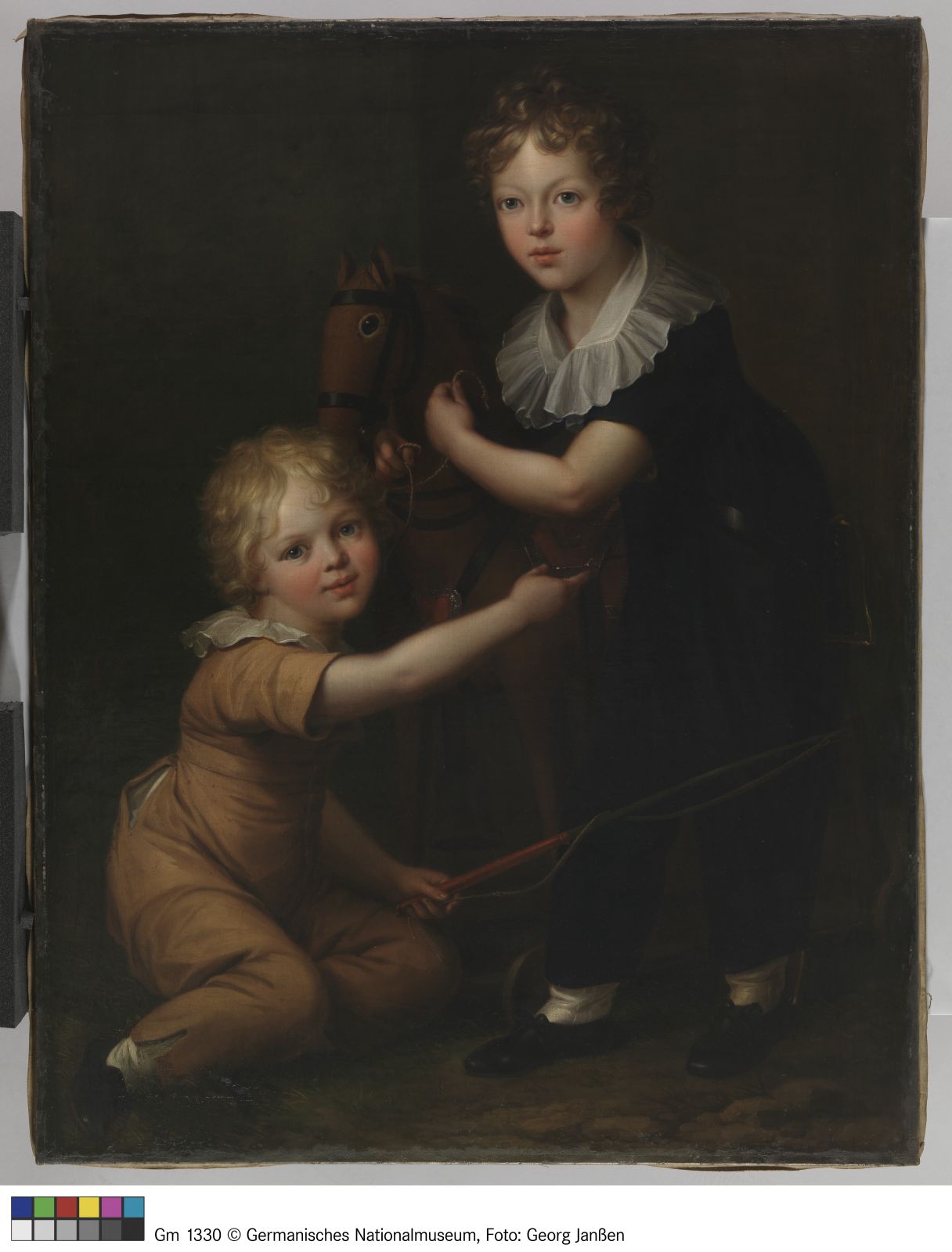 Bildnis zweier Kinder mit einem Spielpferd