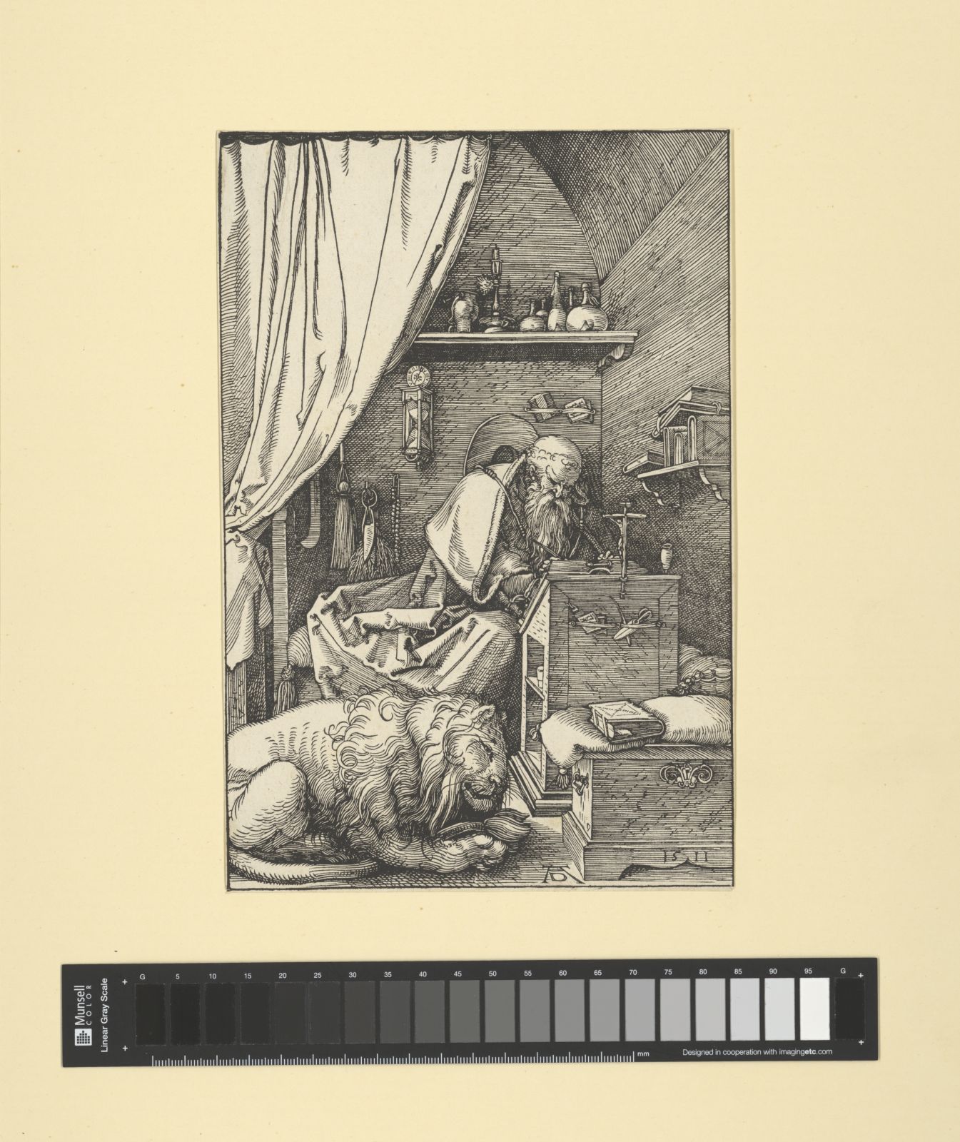 Buch · Eremit · Heiliger · Hieronymus (Heiliger) · Hut · Kardinalsinsignien · Kirchenvater · Kruzifix · Löwe · Religion · Sanduhr · Schreibfeder · Stein · Studierzimmer · Stundenglas · Totenschädel · Westkirche · christliche Religion · katholische Kirche · römisch-katholische Kirche · schreiben · übernatürlich