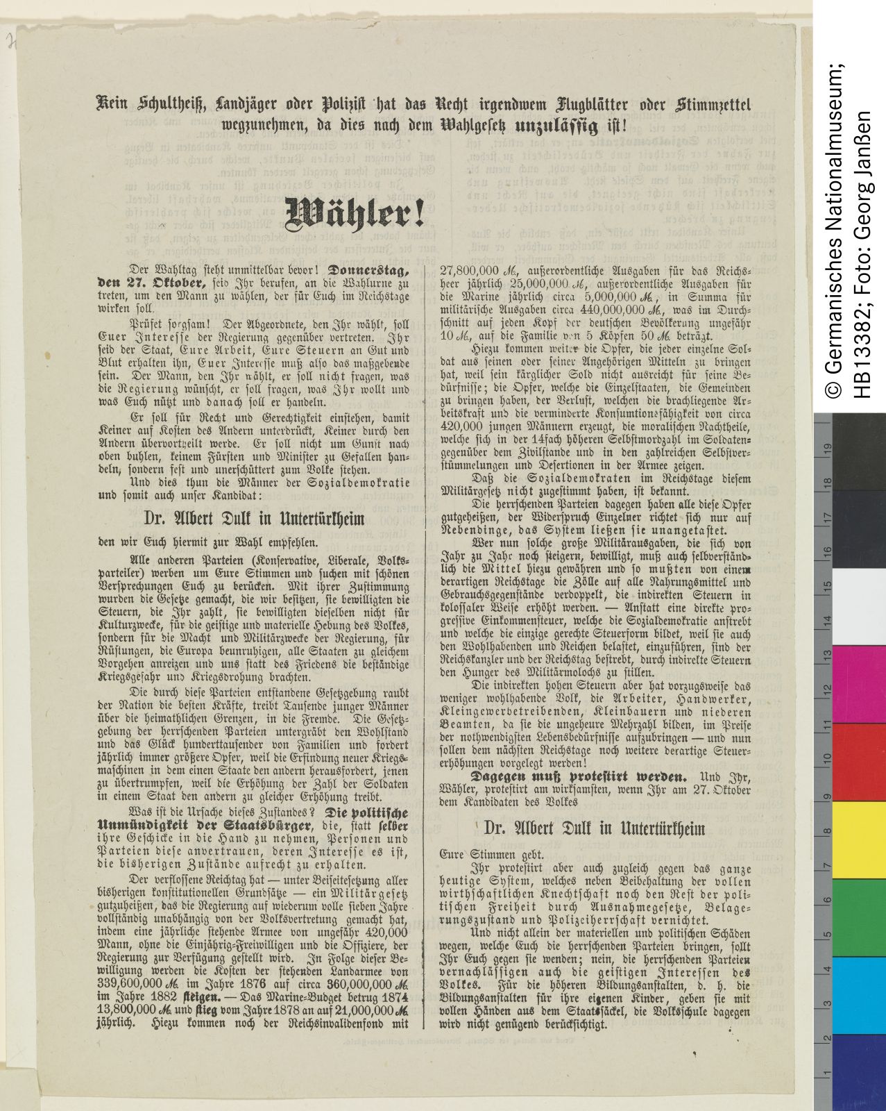 Flugblatt: Wahlaufruf für den Kandidaten Dr. Albert Dulk // zur Reichstagswahl