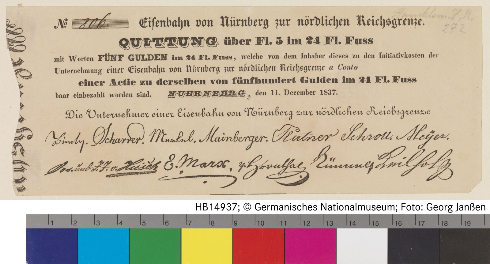 Quittung Nr. 806 der Eisenbahn von Nürnberg zur nördlichen // Reichsgrenze über den Erwerb einer Aktie zu 5 Gulden; // als Kaufdatum wird auf der Aktie der 11.12.1837 genannt