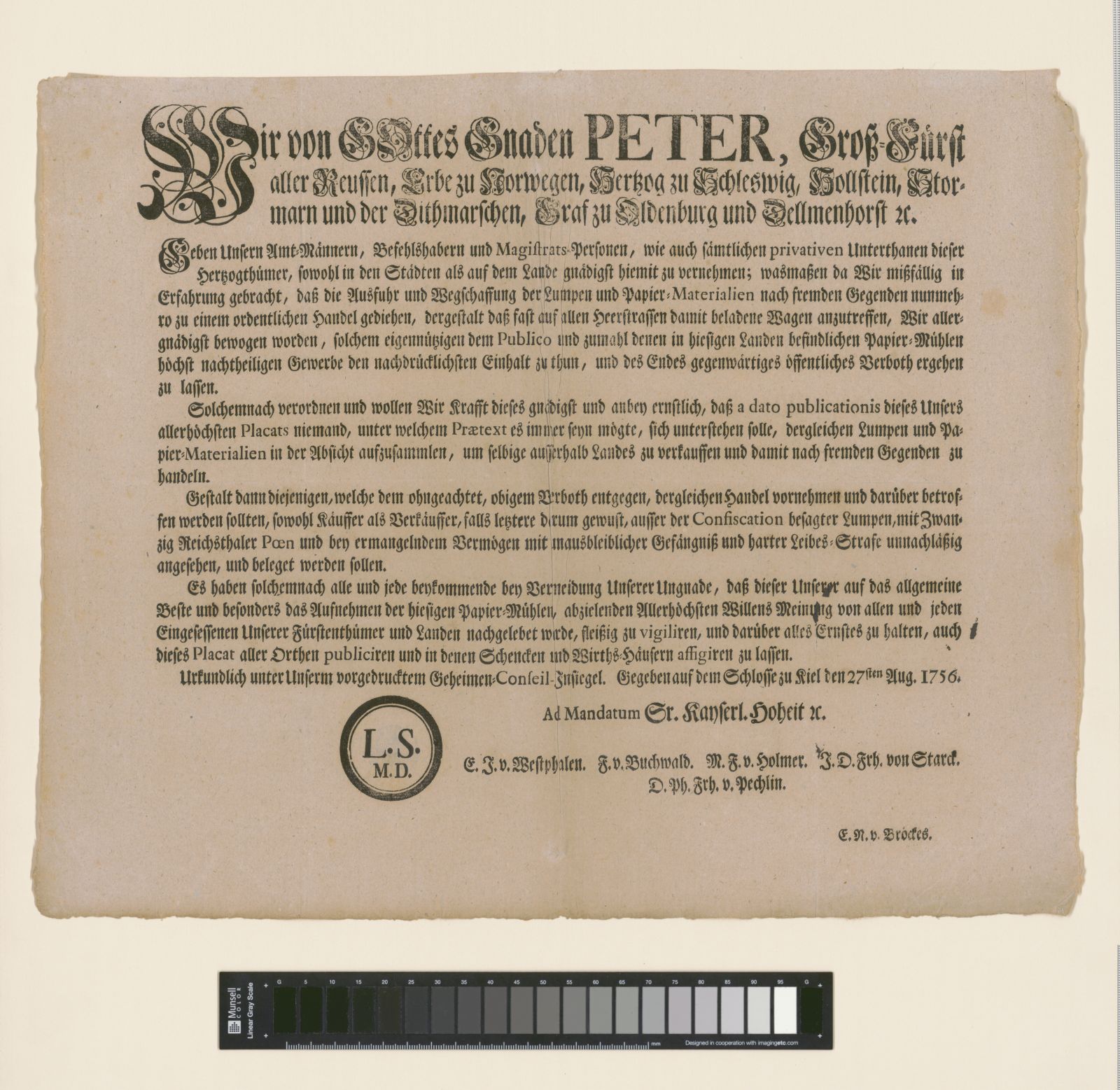 Herzöglicher Erlaß vom 27.8.1756 bezüglich des // Verbotes Lumpen unmd Papierabfälle zum Schaden der // einheimischen Papiermühlen nach auswärts zu verkaufen