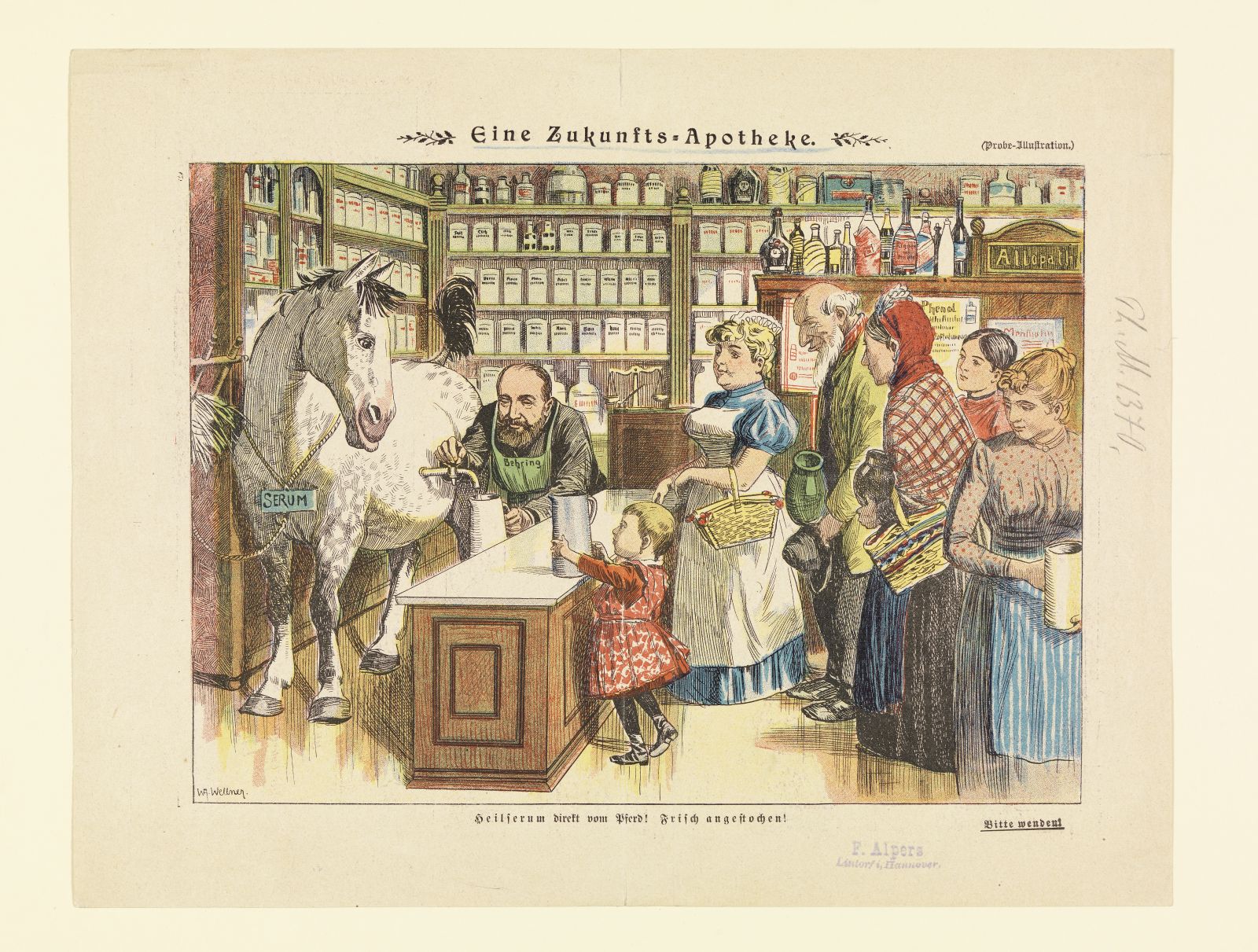 Illustration aus "Lustige Blätter": Emil von Behring zapft in der Apotheke Heilserum vom Pferd