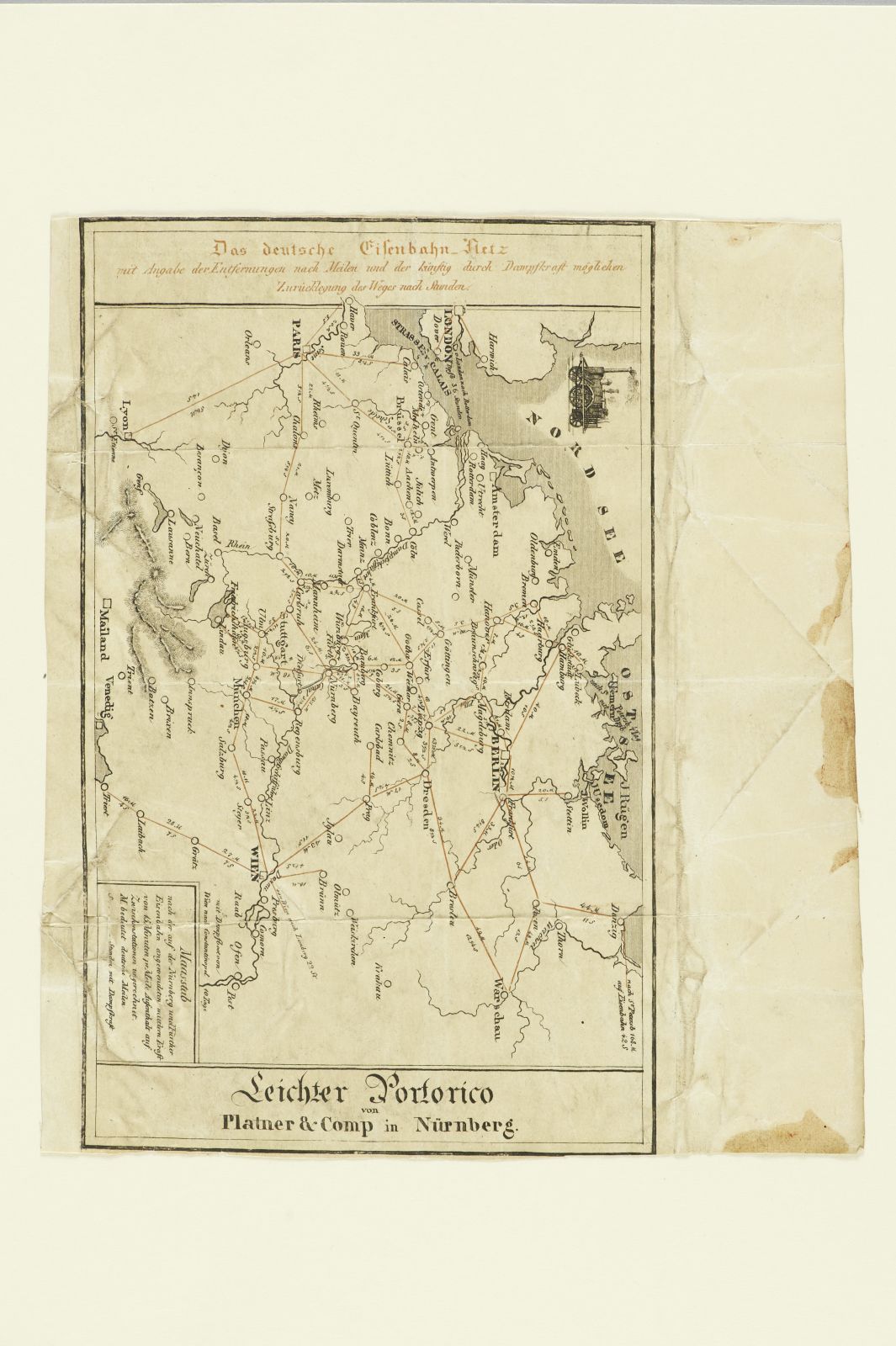 Emballage für Rauchtabak mit Eisenbahn-Streckenkarte