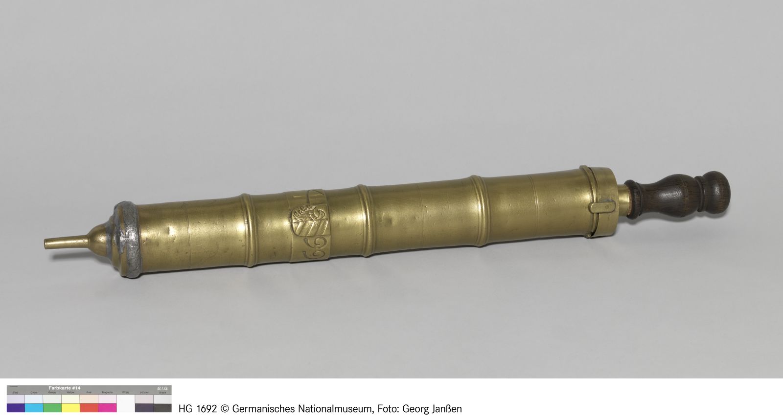 L. ohne Holzgriff 58.0 cm; L. gesamt (mit völlig eingeschobenem Kolben) 70,5 cm; Dm. Zylinder 6,2 cm
