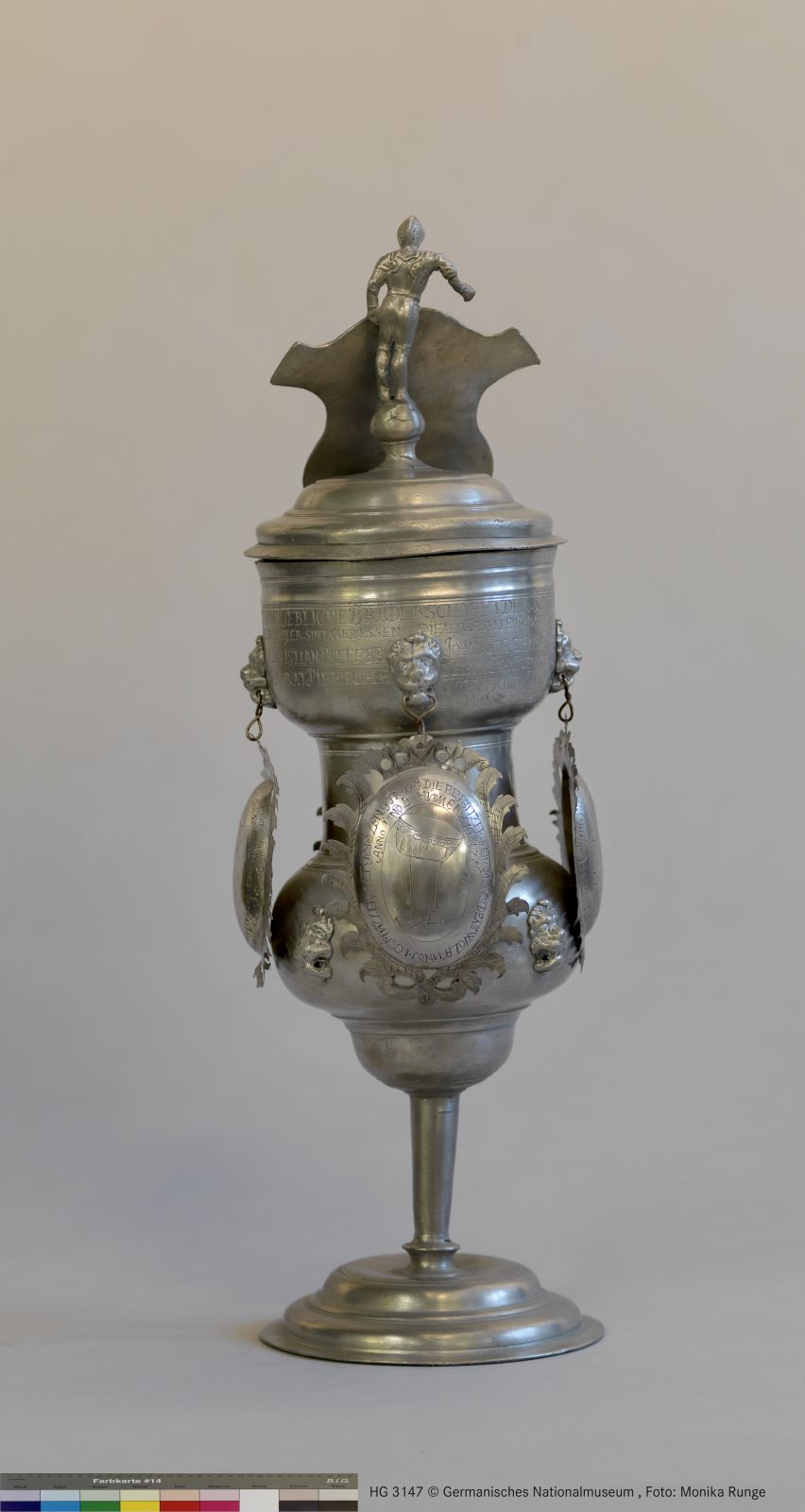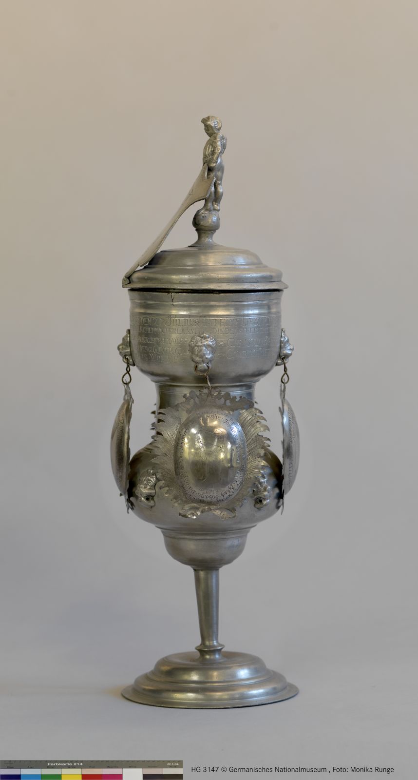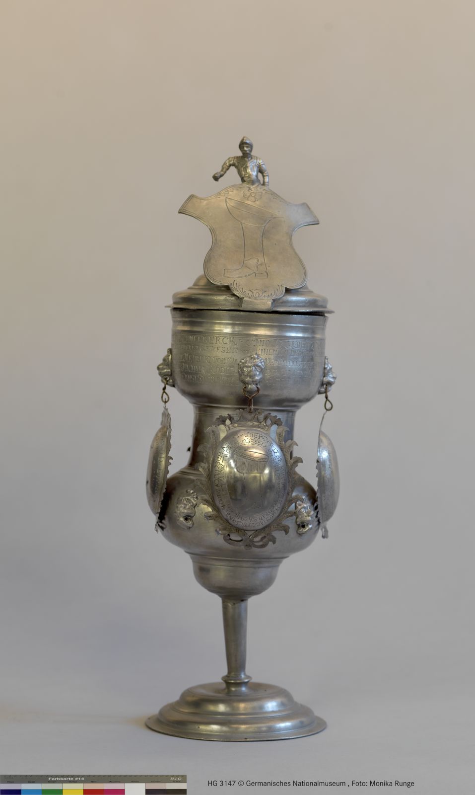 Pokal aus Zinn mit anhängenden Silberschildchen