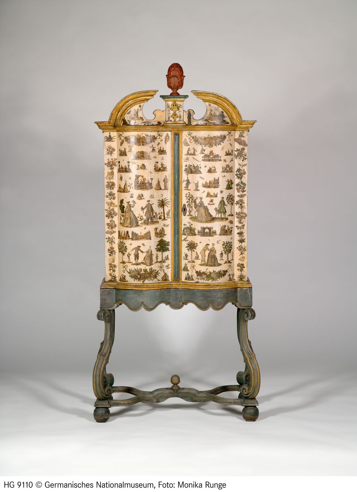 Nadelholz u.a. mit kolorierten Kupferstichen auf weiß (außen) bzw. blau (innen) lackiertem Grund