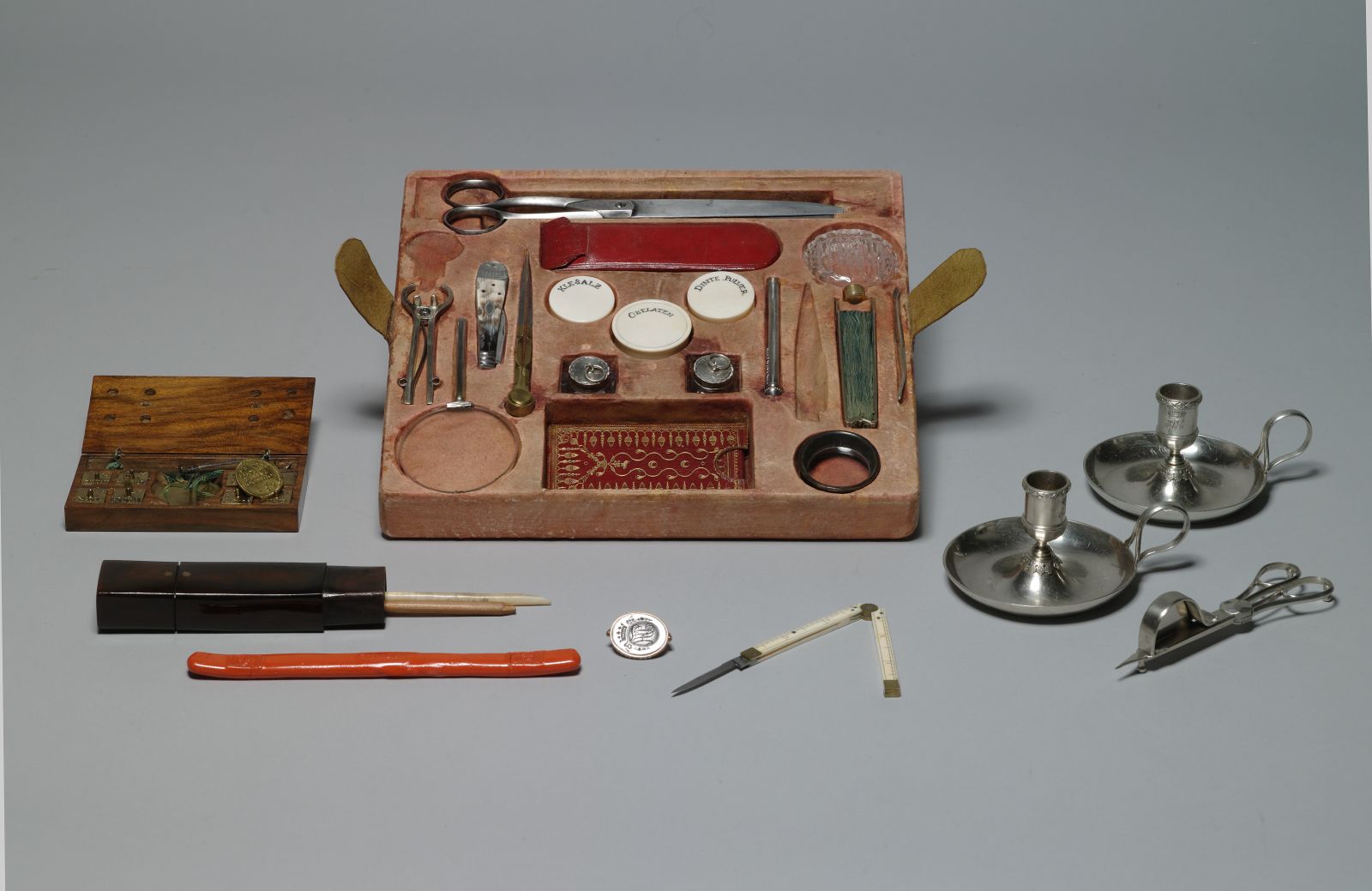 schwarz gefärbtes Elfenbein oder Schildpatt, gedrechselt; Spiegel; Glas; Silber; Leder, gefärbt, goldgeprägt, mit Papier und Textil bezogen