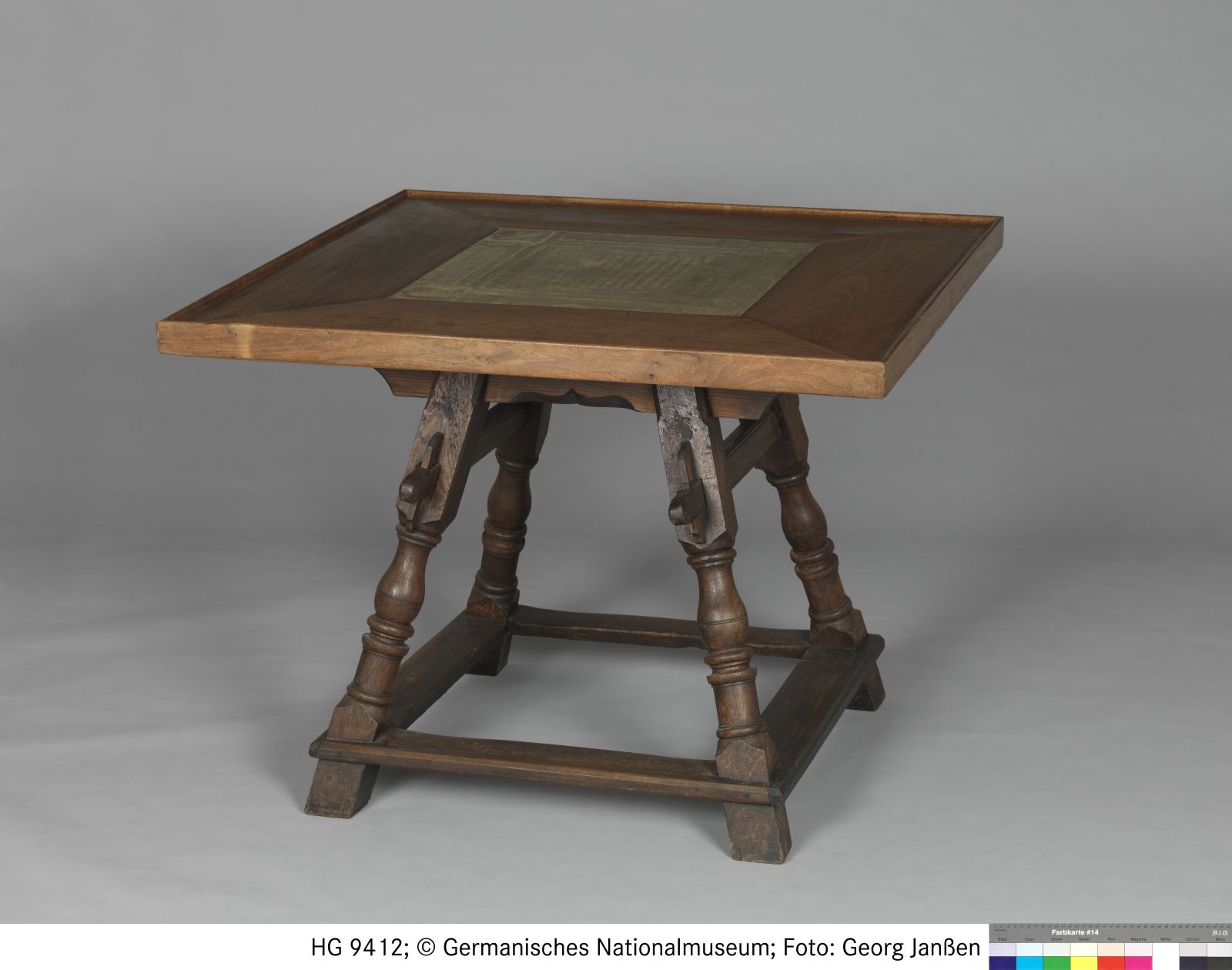 Nussbaumholz, Kalksteinplatte geätzt; Gestell: Eichenholz