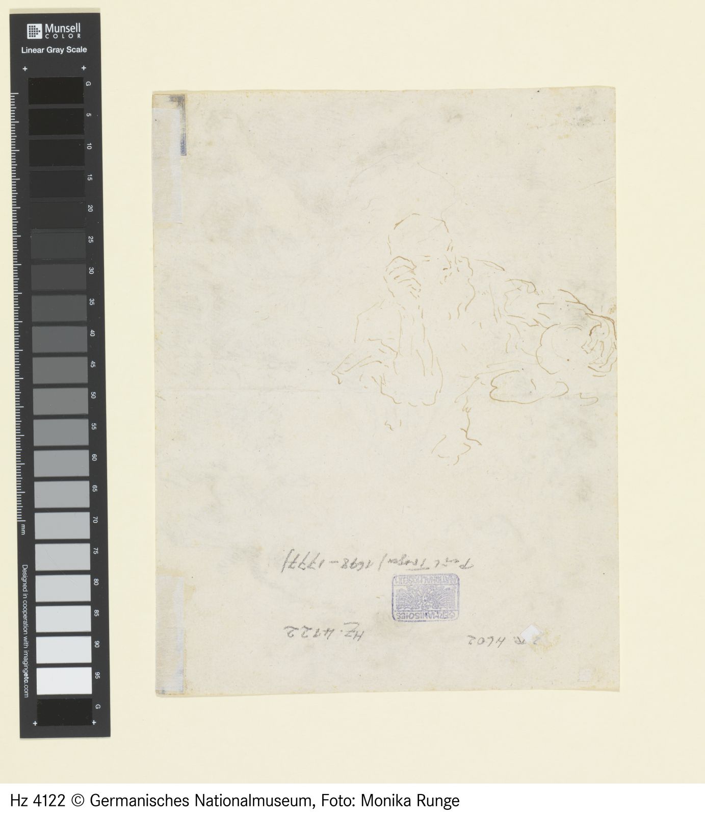 Feder in Braun auf Vergépapier mit Wasserzeichenfragment
