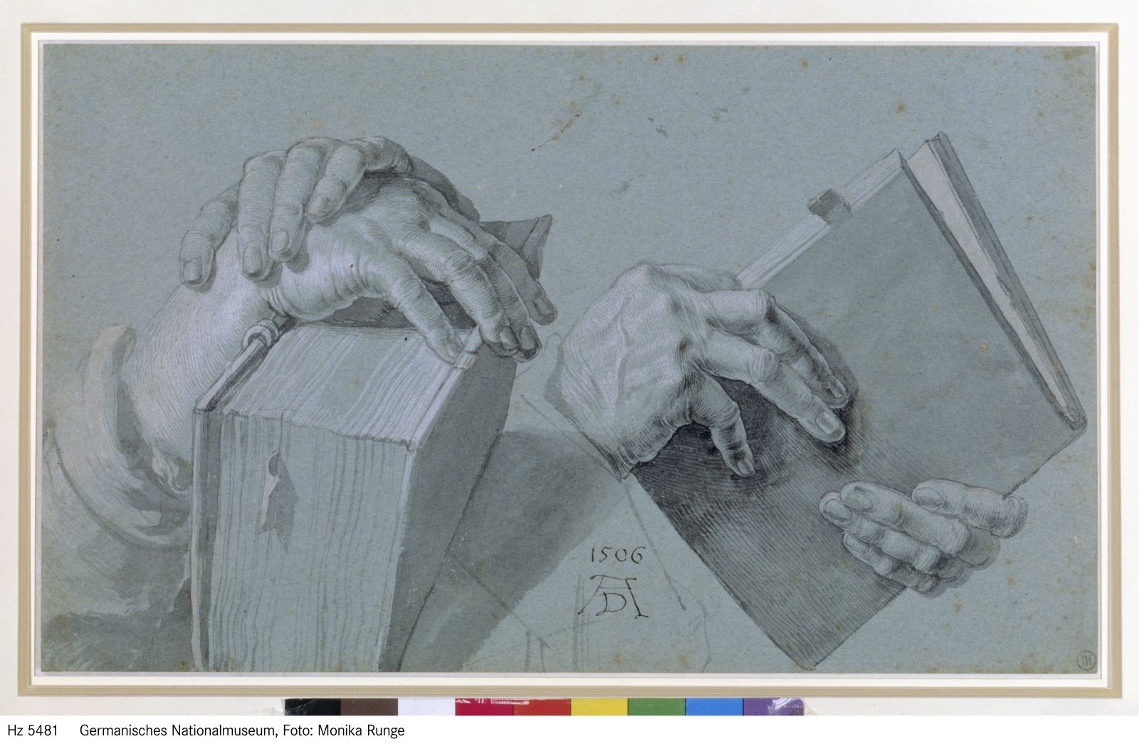 Pinsel in Schwarz, grau und ocker laviert, weiß gehöht, auf venezianischem blauem Tonpapier