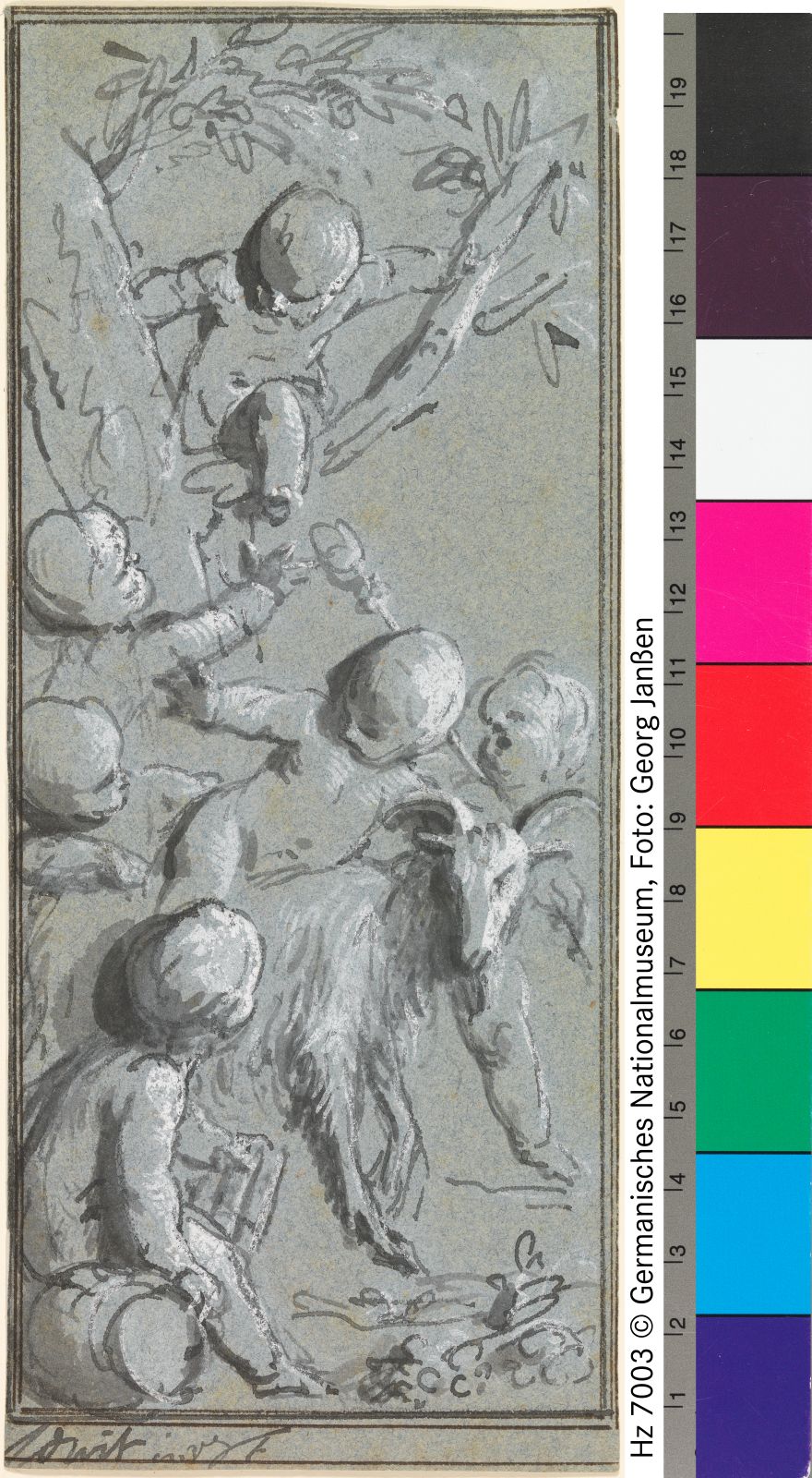 Feder und Pinsel in Grau, Deckweiß auf blauem Papier; Einfassungslinien (Feder in Braun und Schwarz)