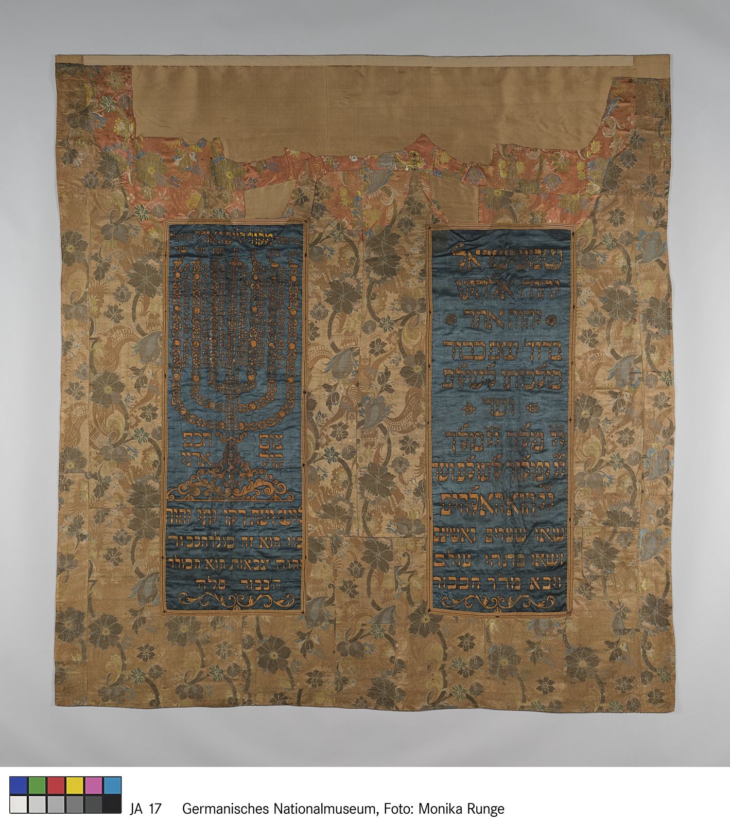 blau, ergänztes Seidengewebe an oberer Kante von Restaurierung 1981.