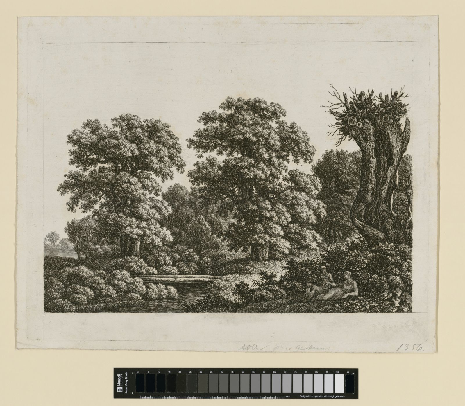 Wiesenlandschaft mit totem Baumstumpf, einer Frau und einem Mann