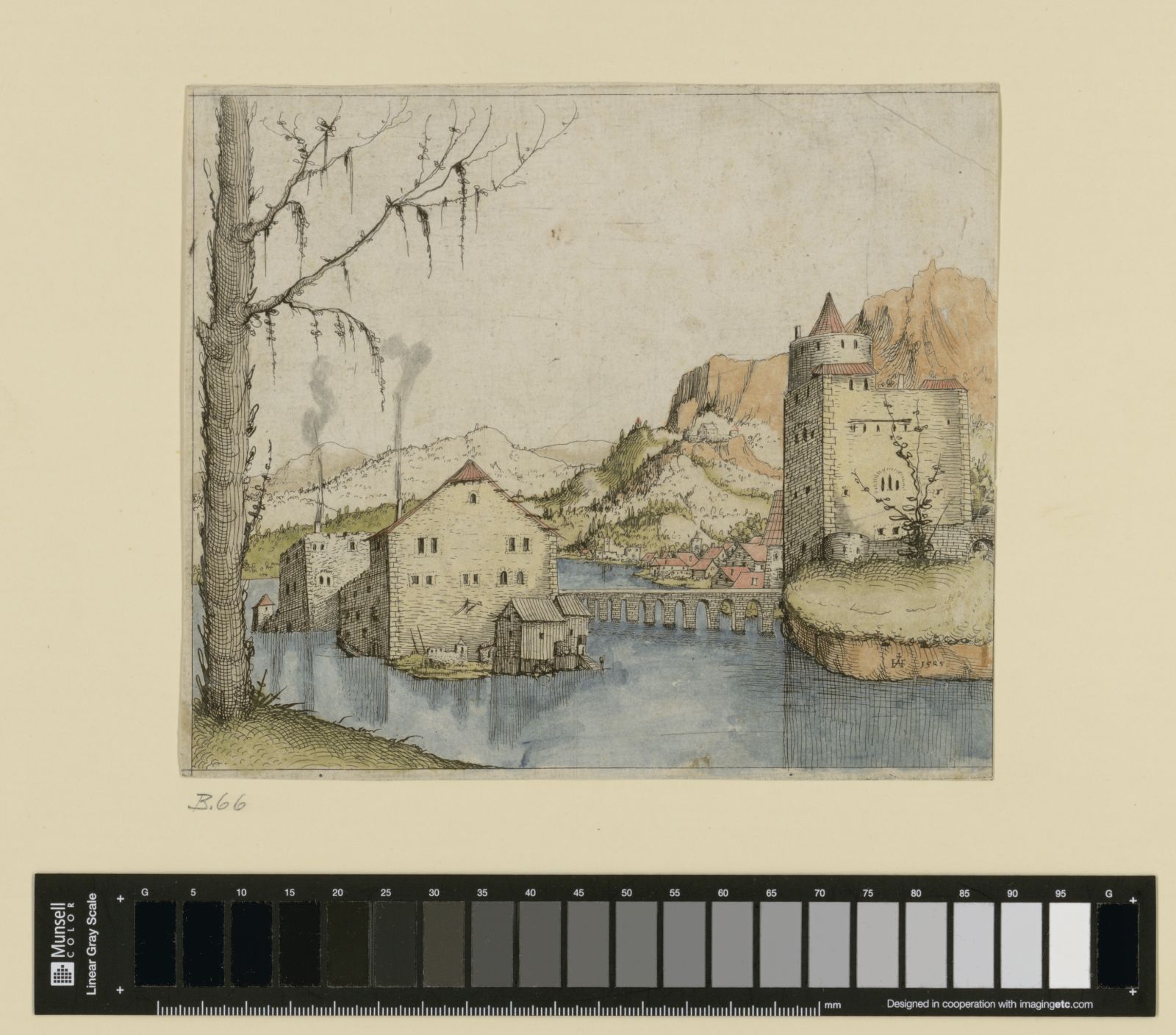 Radierung, aquarelliert (Blau, Grün, Ocker, Rot, Grau)