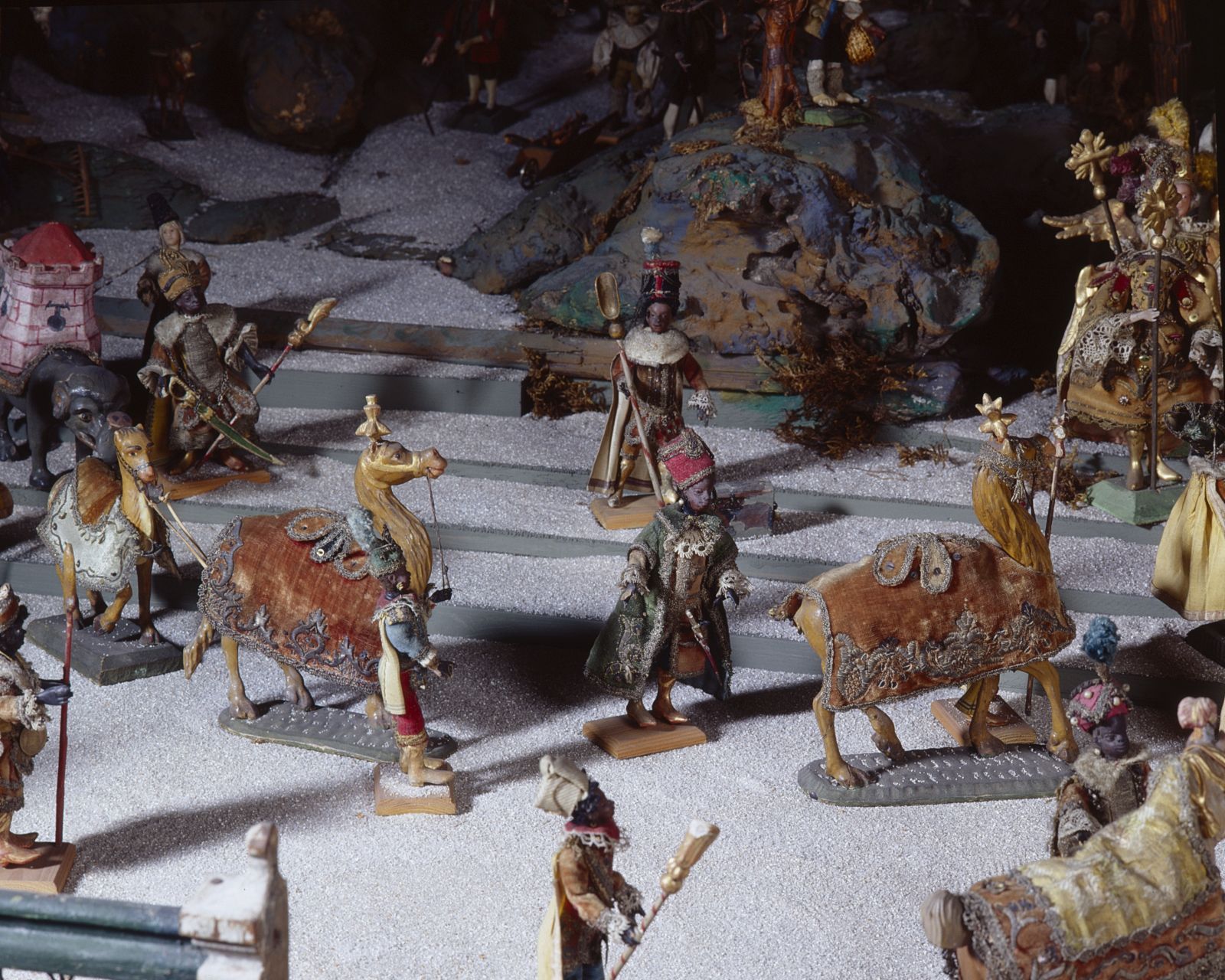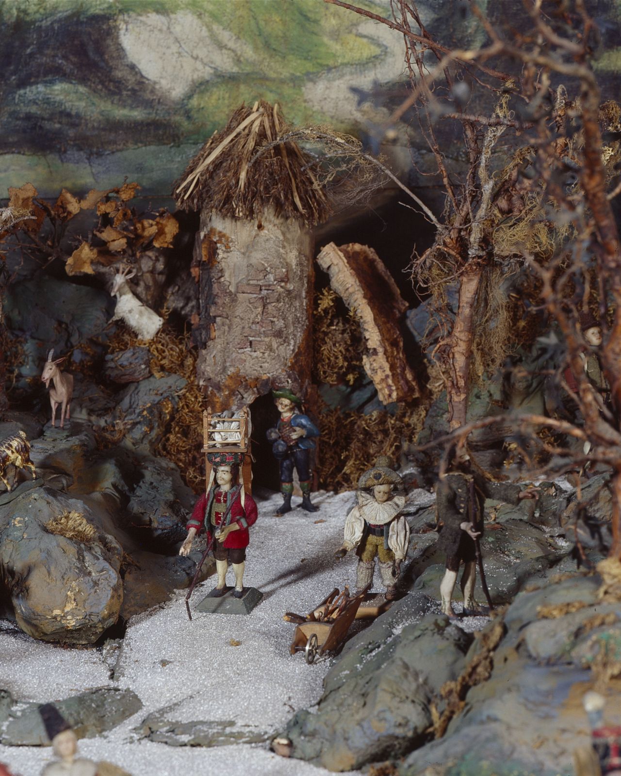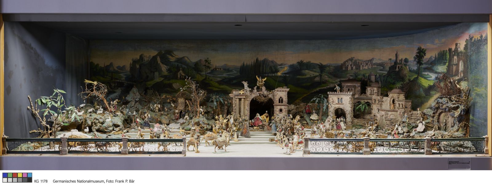 Weihnachtskrippe, bestehend aus 117 bekleideten Figuren mit Wachsköpfen und holzgeschnitzten Gliedern, 4 ganz aus Holz geschnitten, ursprünglich nicht zugehörigen Figuren, einem ganz aus Wachs modellierten Christkind, 69 holzgeschnitzten Tieren (darunter fünf Pferde, sieben Kamele, ein Elefant), drei Wagen mit Zubehör, ein Pflug, einem aus Holz gezimmerten Haus (für die Hochzeit zu Kanaan), 138 Einzelteile (Hausrat etc.) aus Holz, Zinn, Blech, Messing, Kupfer, Glas, Fayence, einem Krippenberg aus fünf Teilen (Stallruine, Paläste, Landschaft und Einzelteile), einem runden Holzturm, acht Bäumen, einer Balustrade, (dreiteilig) sowie einem Hintergrundprospekt (Öl auf Leinwand, L. 560 cm, H. 74,5 cm).
