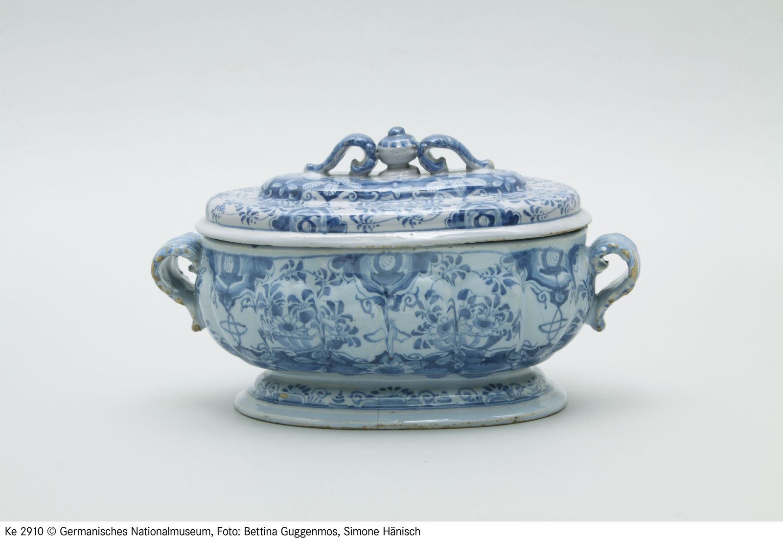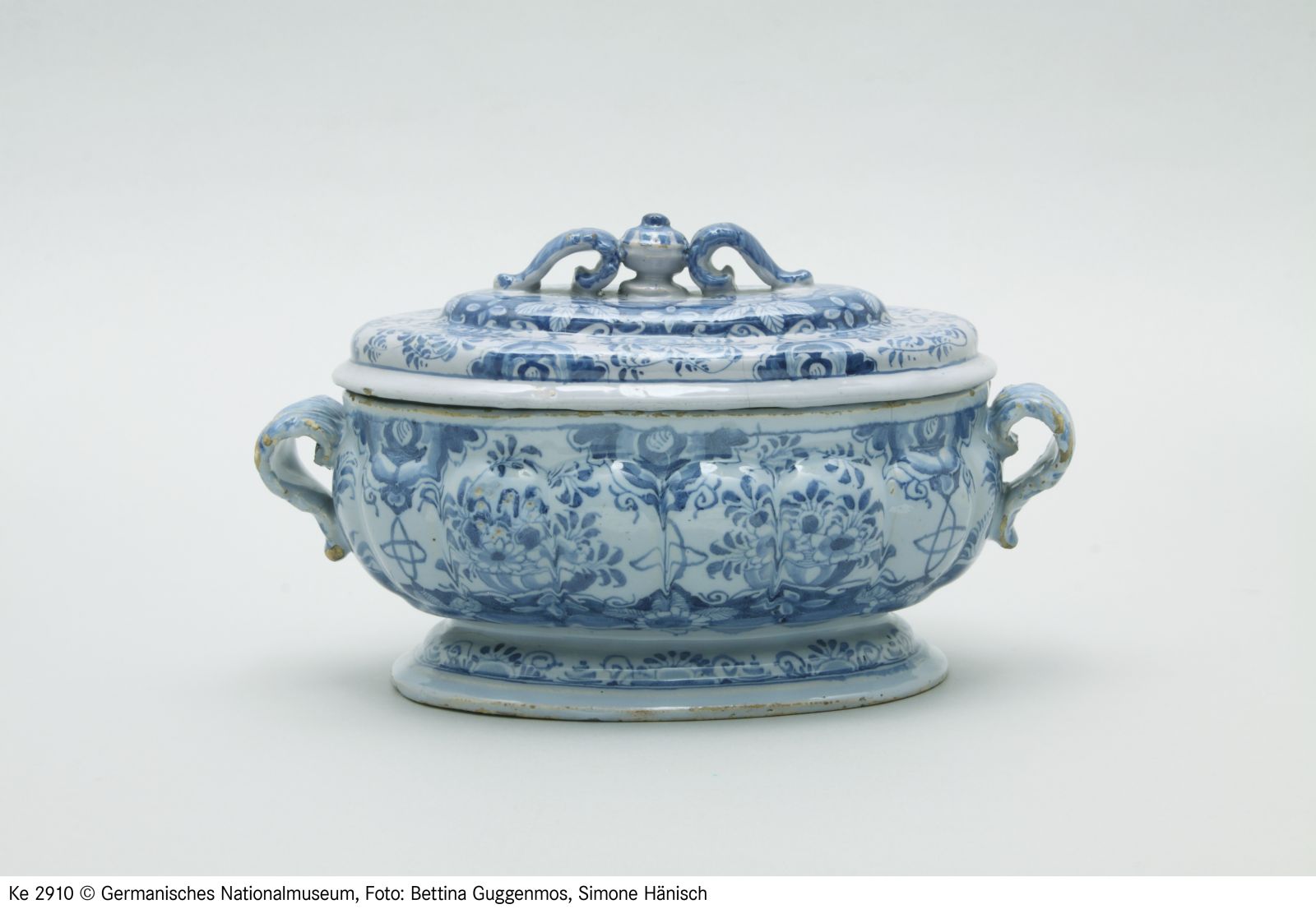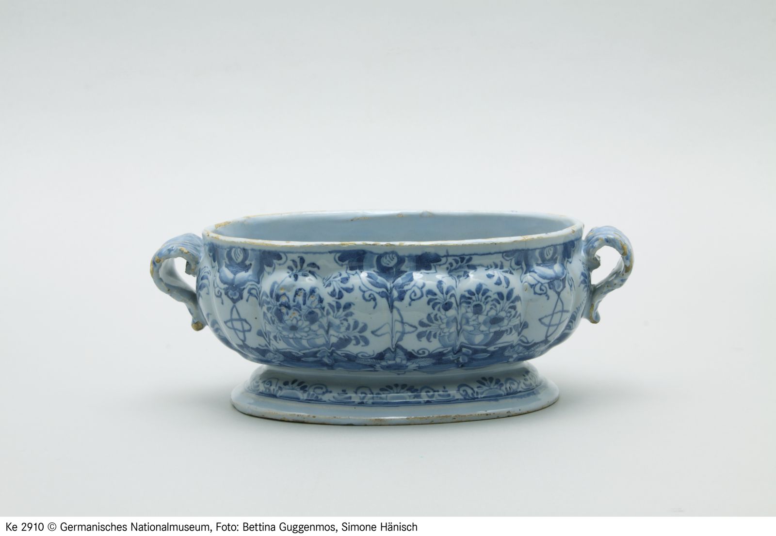 Fayence. Gelblicher Scherben, hellblau glasiert, blau bemalt