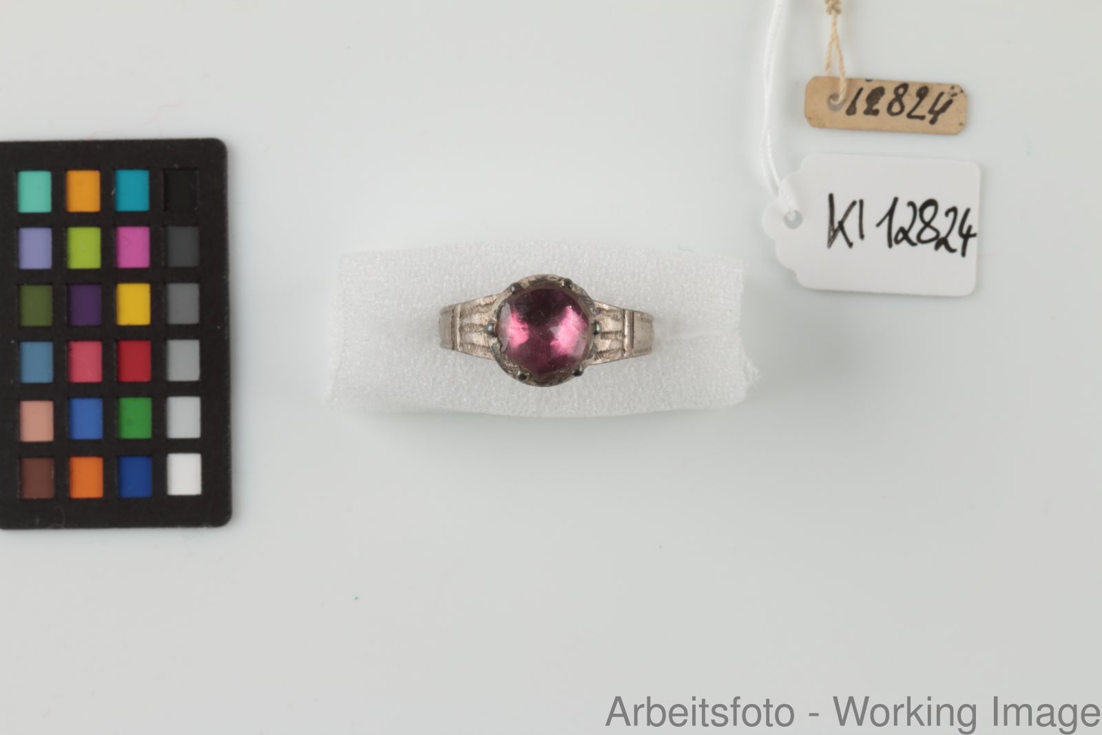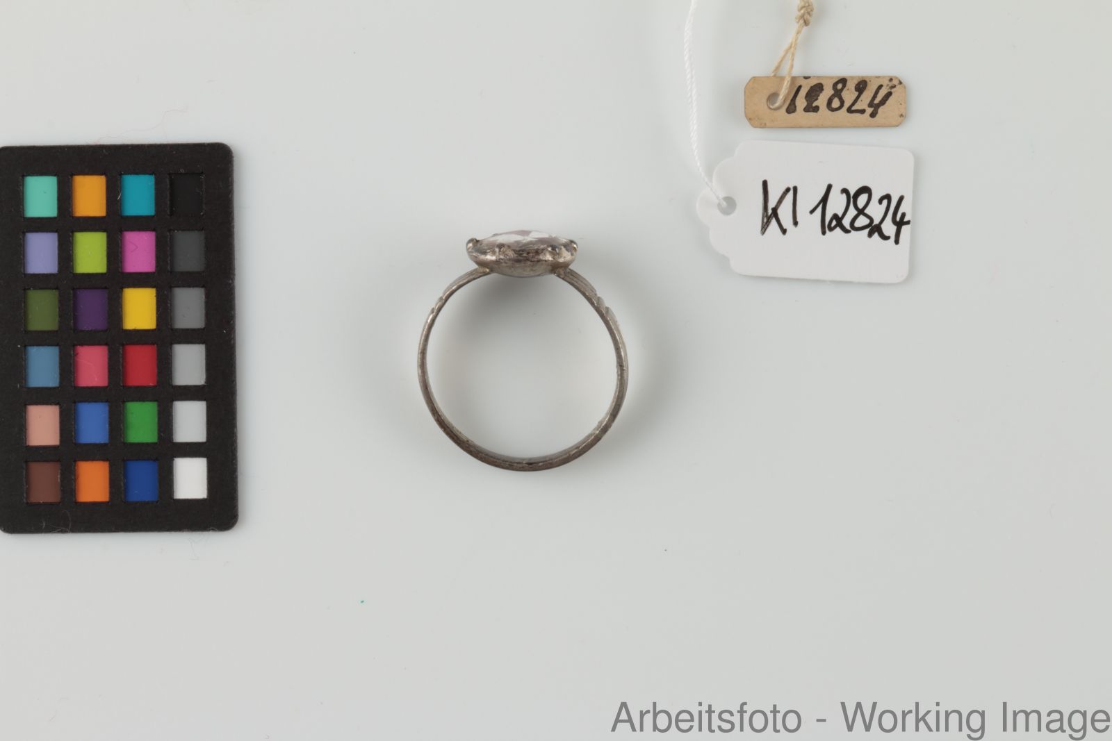 Silber, farbloser Glasstein, rote Farblackhinterlegung