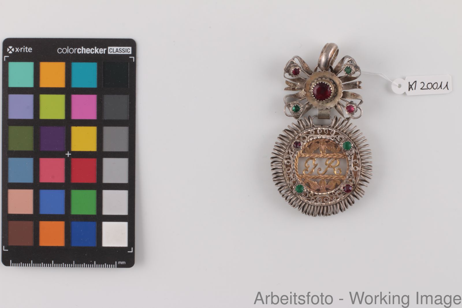 Silber, Silberfiligran, Kupfer vergoldet, Glassteine rot, grün