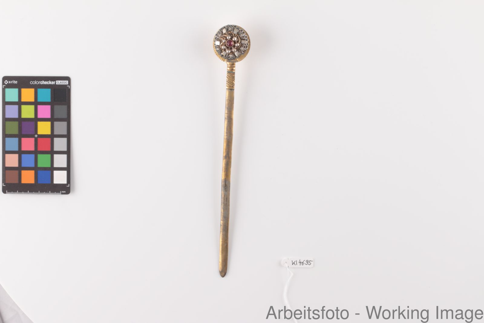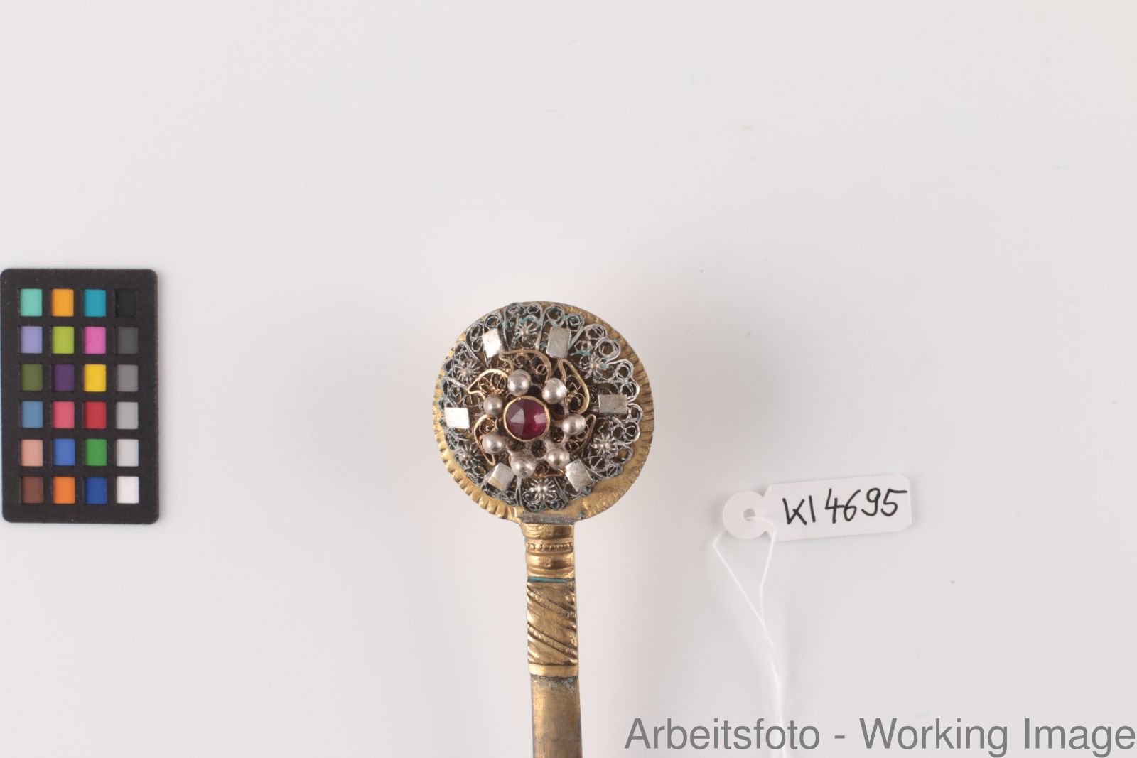 Messing vergoldet, Silberfiligran, 1 roter Glasstein