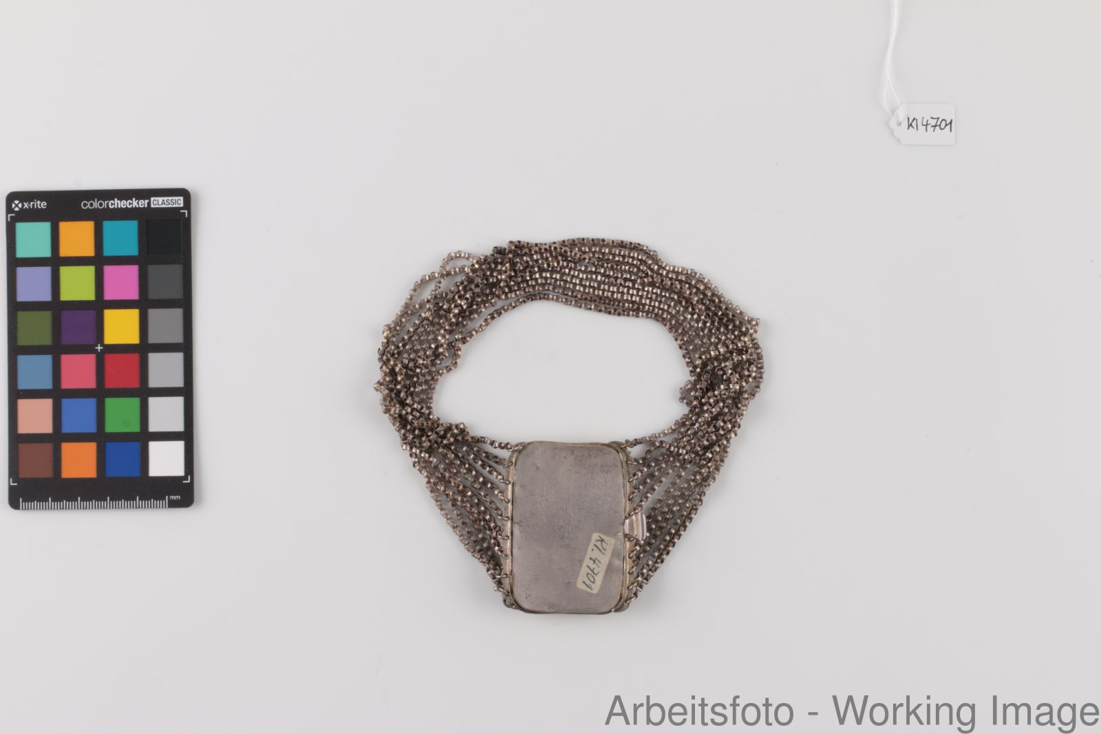 Silber, Silberblech, teilvergoldet, Silberfiligran, vergoldet, Glasperlen mit Wachseinzug, blaue, grüne und türksfarbene Glassteine