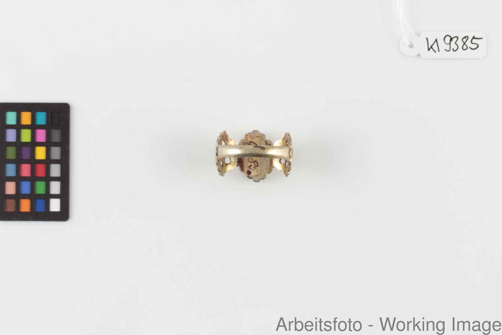 Silber, gegossen, vergoldet, 4 rote Glassteine