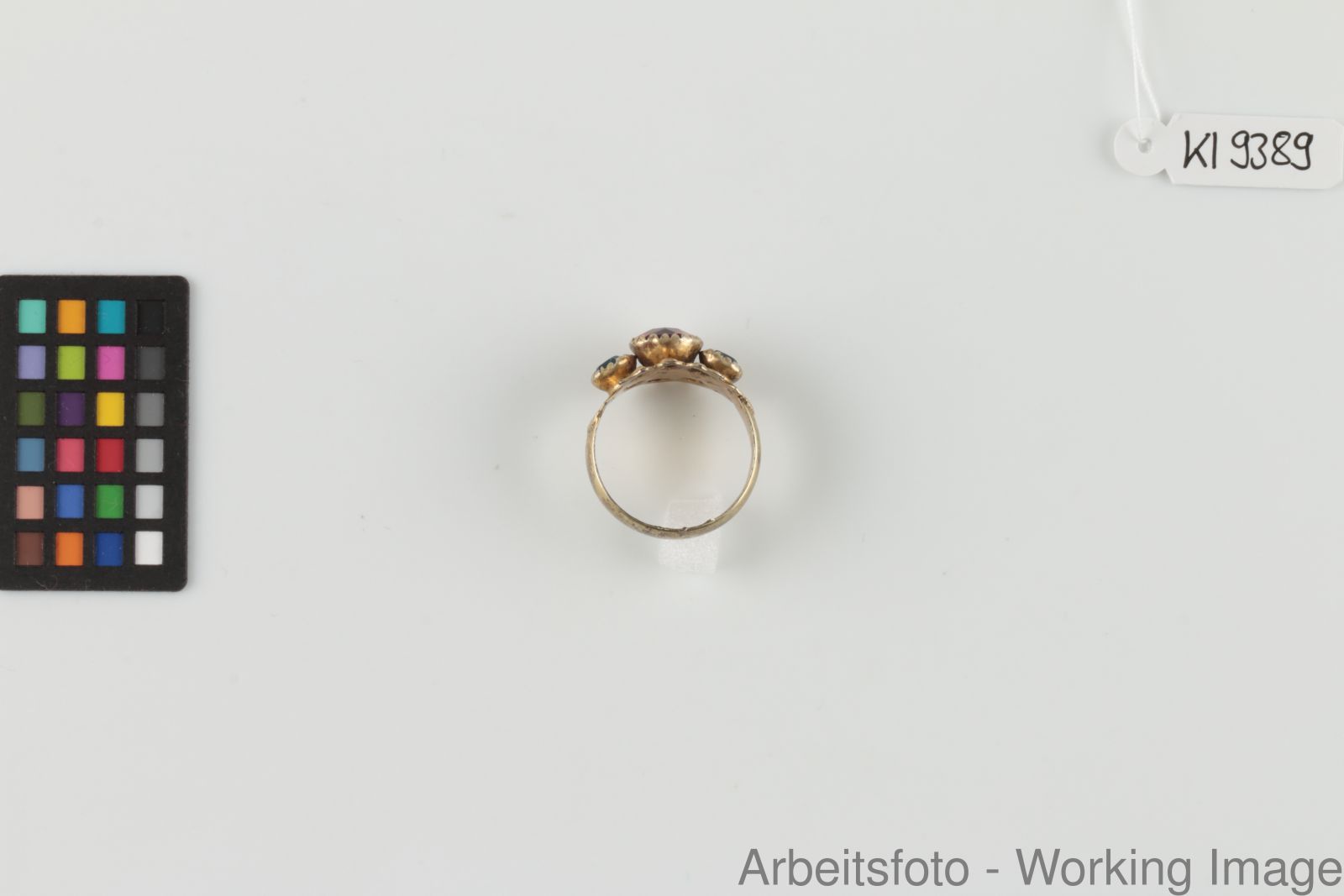 Silber, vergoldet, 1 roter Glasstein, 2 blaue Glassteine