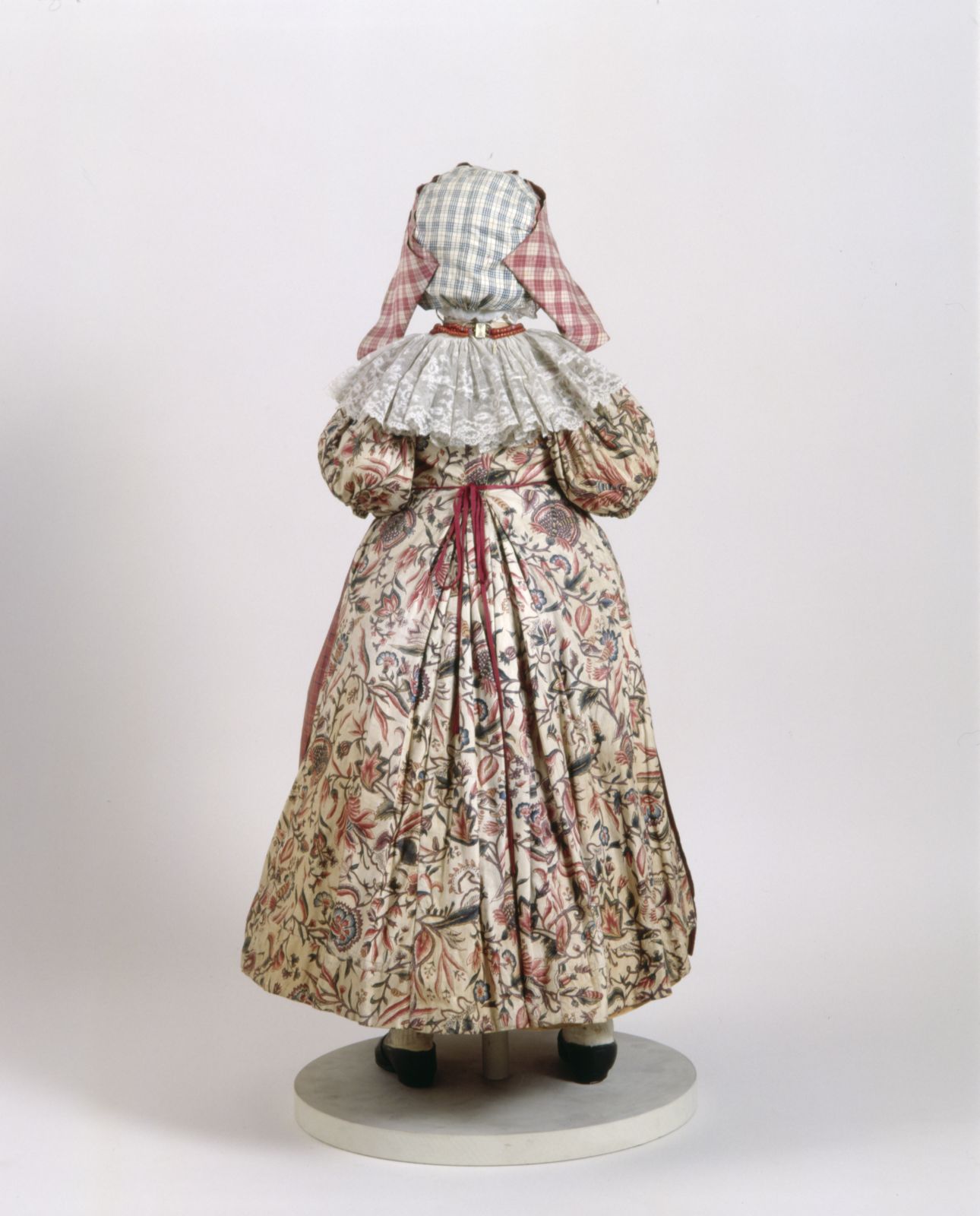 Kleid: Baumwolle; Leinwandbindung; Schürze: Baumwolle, kariert; Leinwandbindung; Halskette: Glasperlen. - Kleid: bedruckt (Chintz)