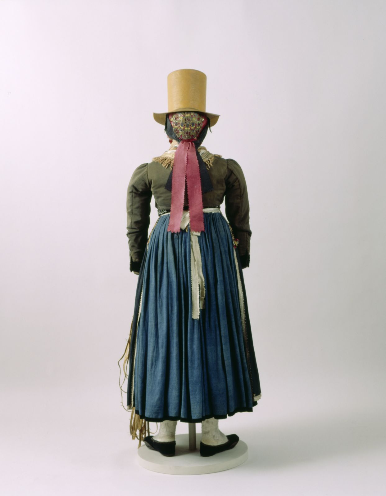 - Schürze: Baumwolle, blau; Leinwandbindung; Bänder: Seide; Baumwolle