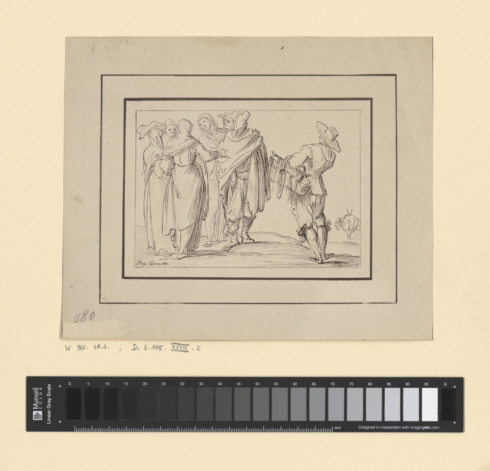 Gruppe aus Männern und Frauen, rechts ein Mann mit Korb
