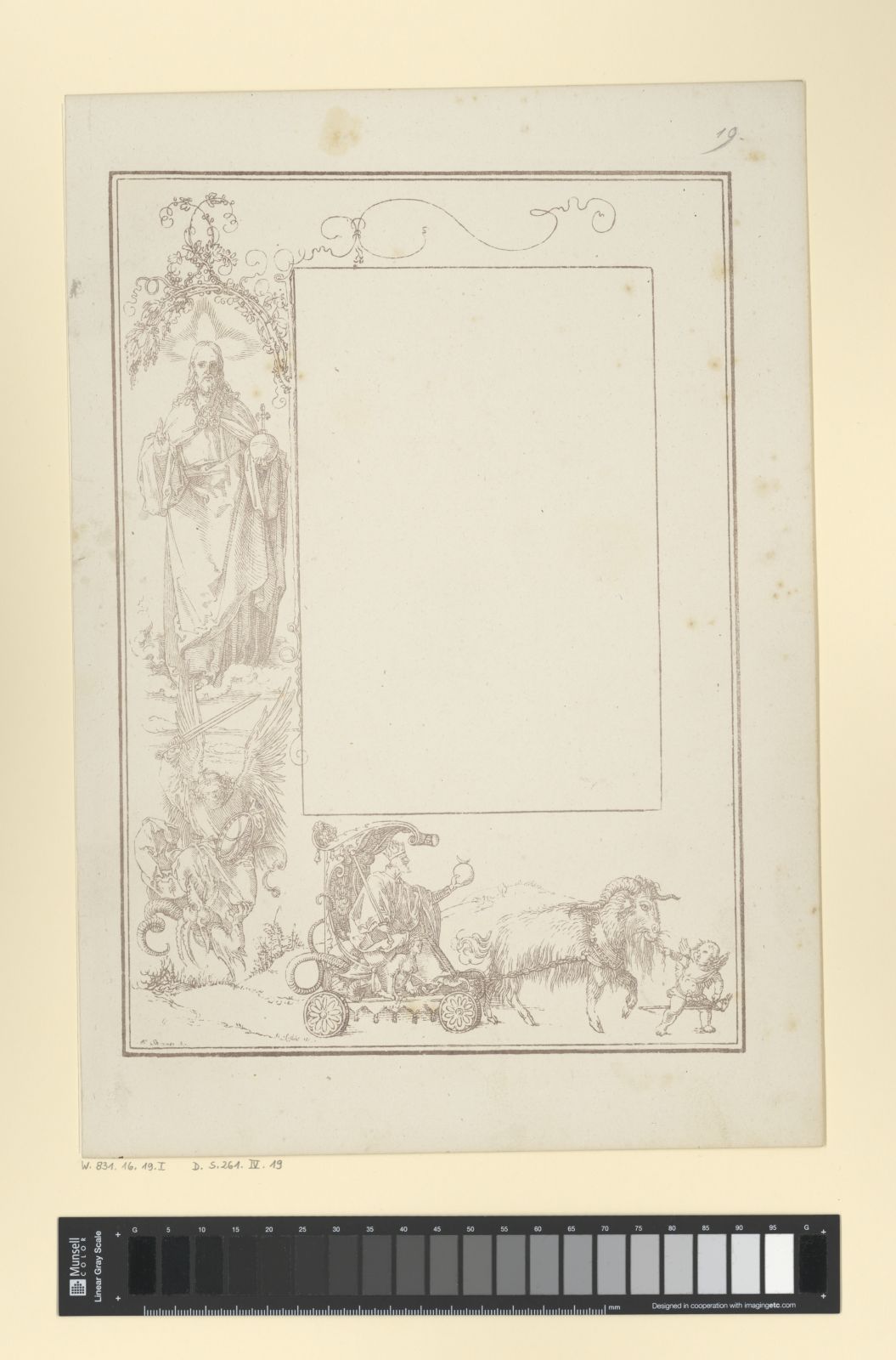 Blatt 19 aus: Albrecht Dürers christlich-mythologische Handzeichnungen (Christus, König von einem Bock gezogen, Putto, Michael kämpft gegen den Drachen)