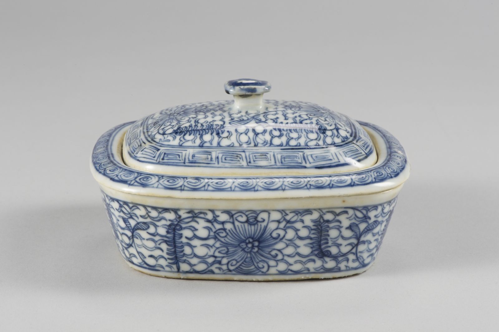Porzellan, bläuliche schimmernde Glasur, blauer Unterglasurdekor;