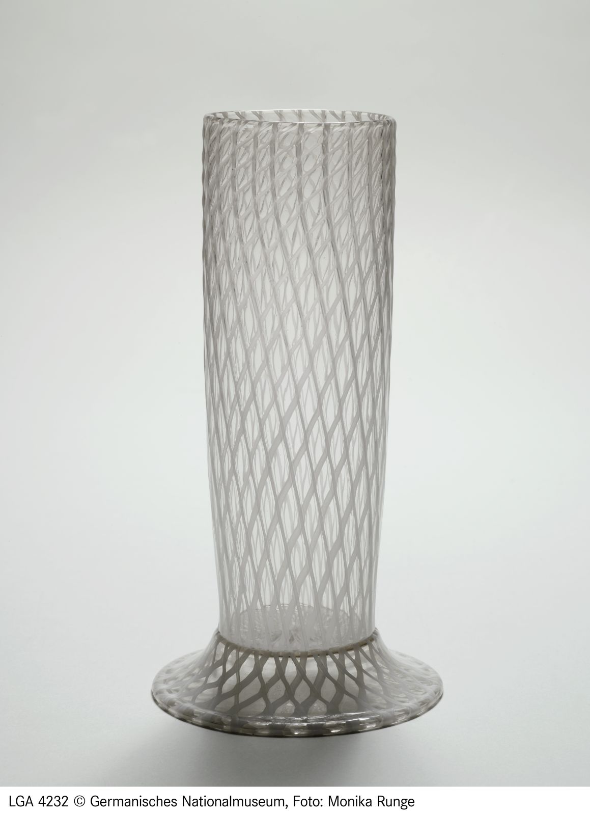 Entfärbtes Glas mit aufgeschmolzenen weißen Milchglasfäden