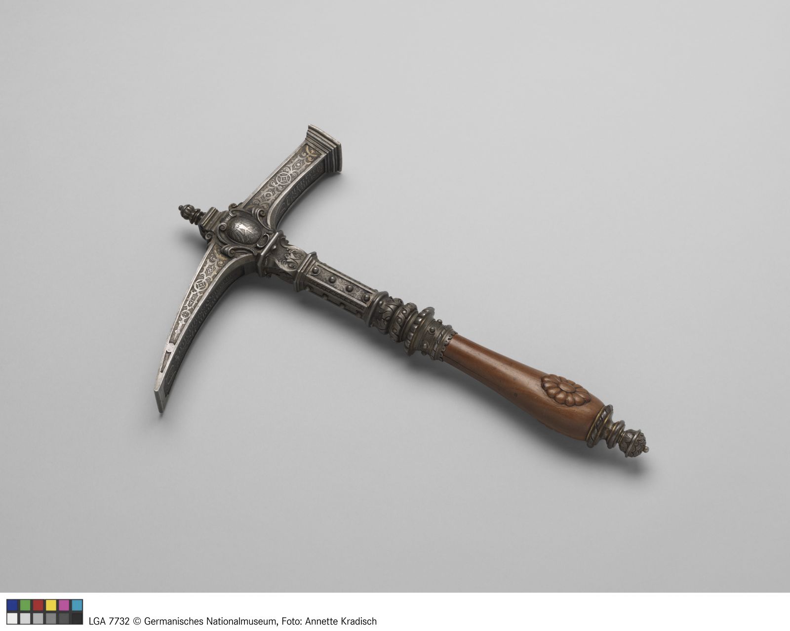 Hammer: Eisen, geätzt, graviert, Reste von Vergoldung, Nußbaumholz; Kasten: Holz, Kunststoffteppich, Messing, Eisen/Stahl
